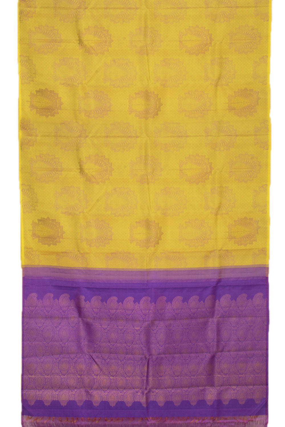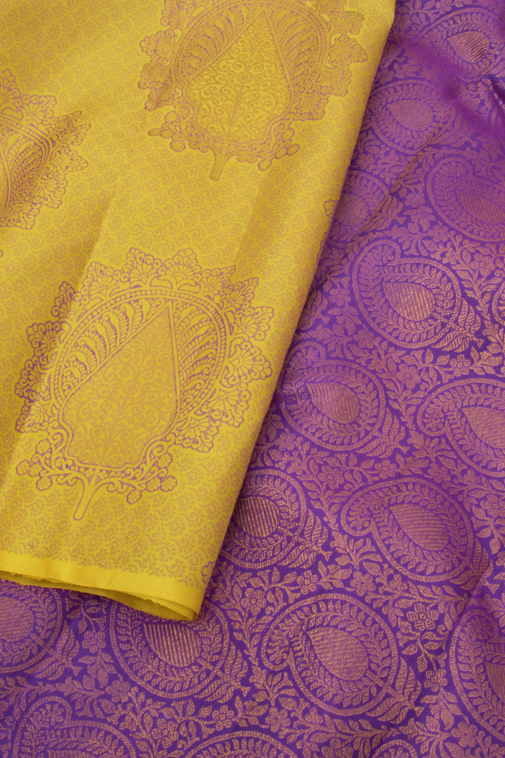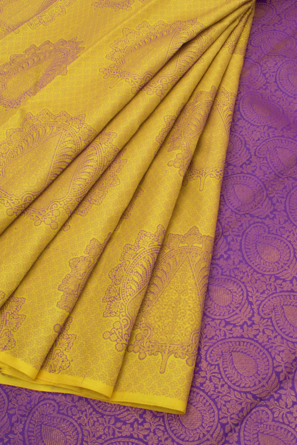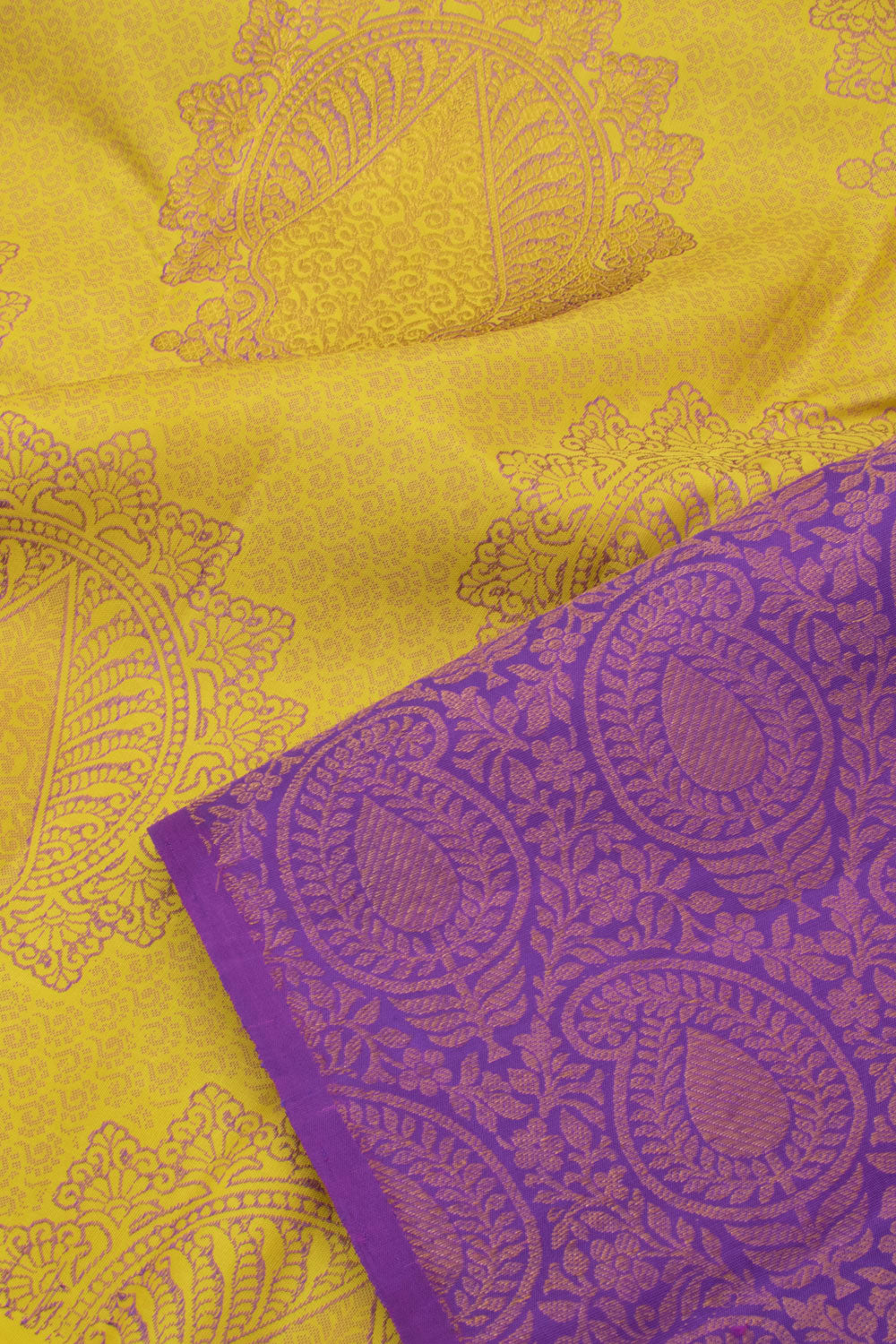 This Amber Yellow Handloom Pure Zari Kanjivaram Silk Saree boasts a stunning Borderless Design. The body is adorned with beautiful floral patterns created through Nakashi Weaving. The zari paisley motifs on the violet pallu add a touch of elegance, and the saree comes with a matching Violet Blouse.