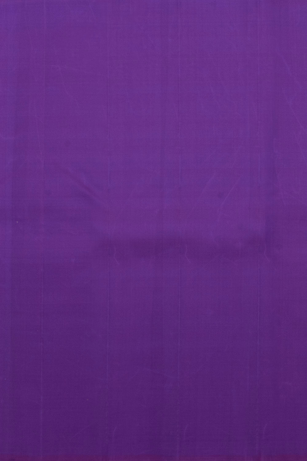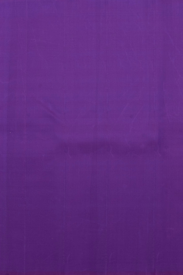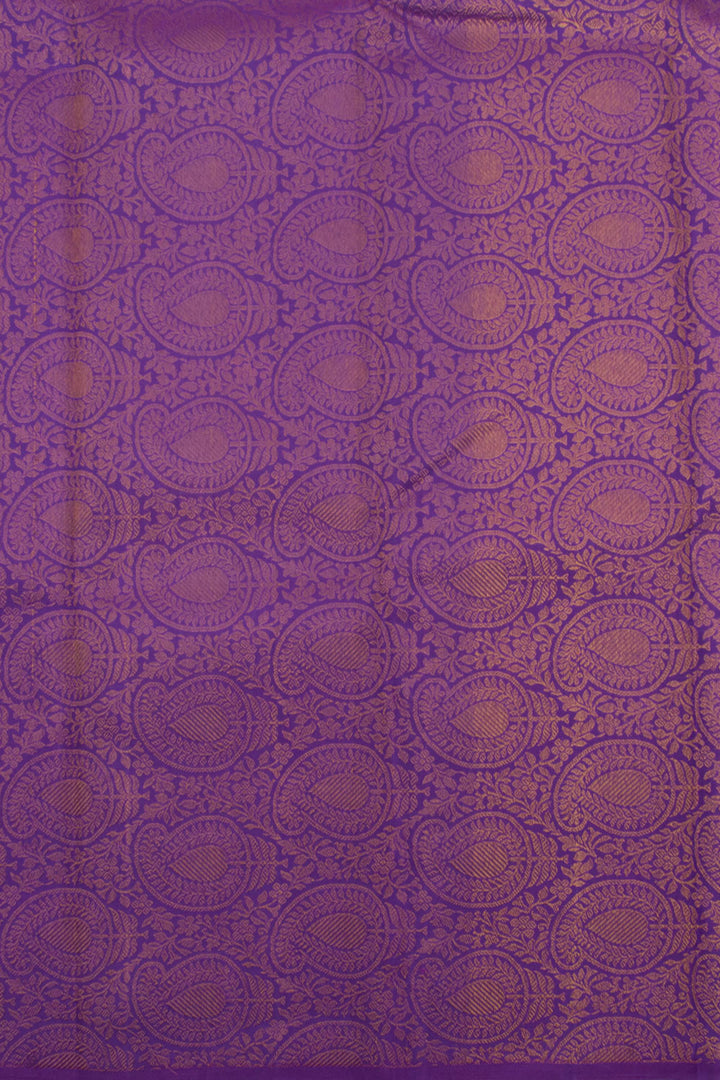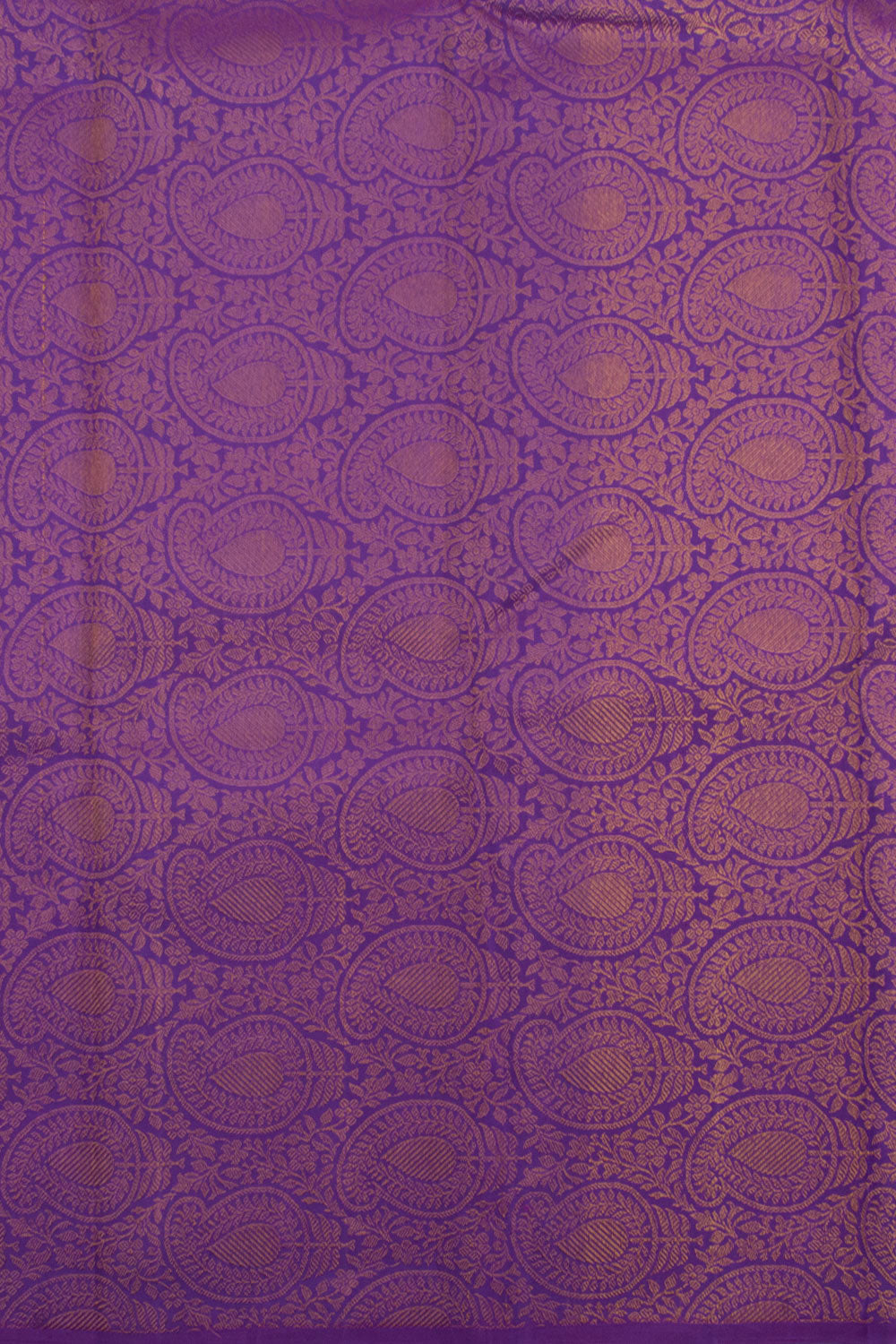 This Amber Yellow Handloom Pure Zari Kanjivaram Silk Saree boasts a stunning Borderless Design. The body is adorned with beautiful floral patterns created through Nakashi Weaving. The zari paisley motifs on the violet pallu add a touch of elegance, and the saree comes with a matching Violet Blouse.