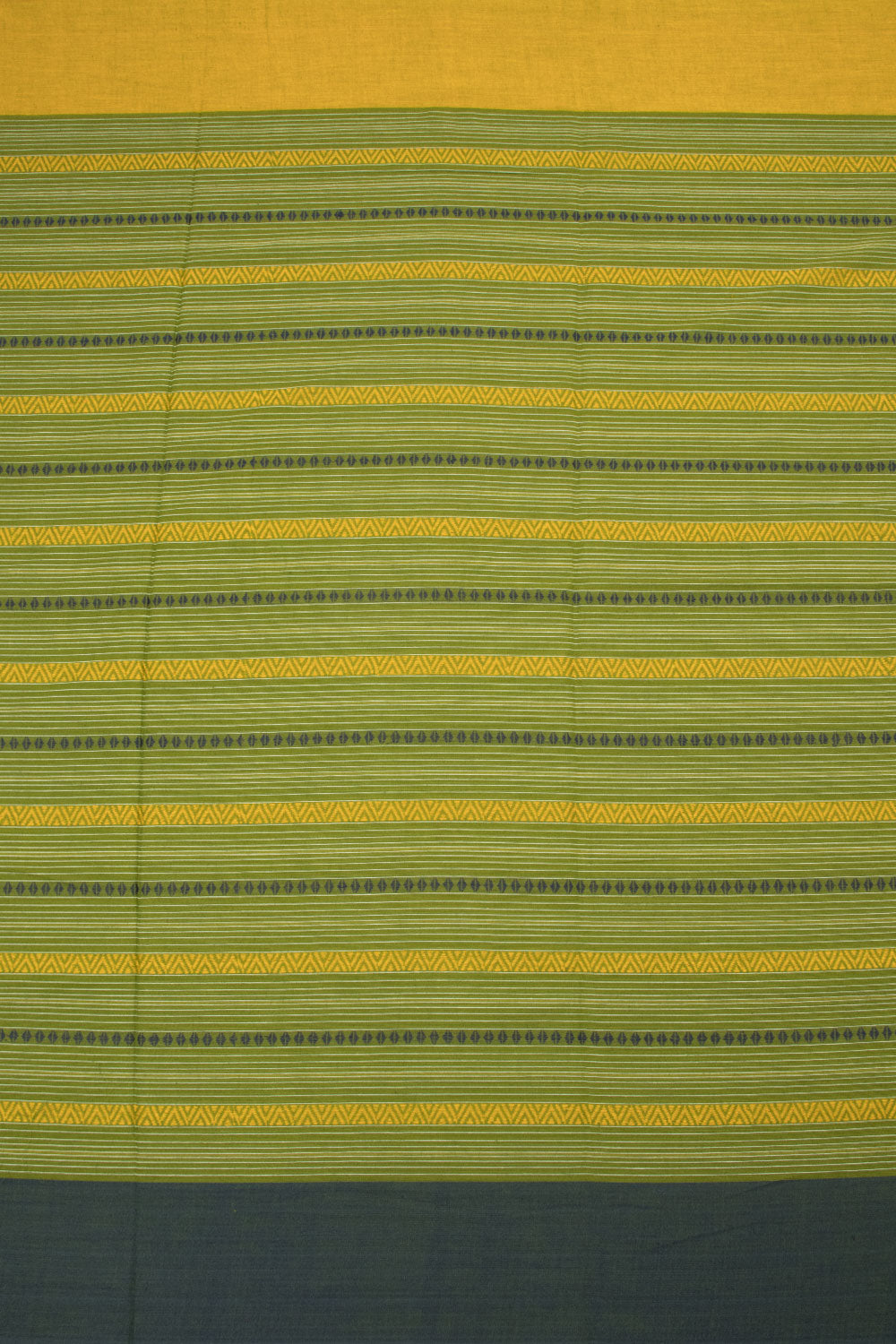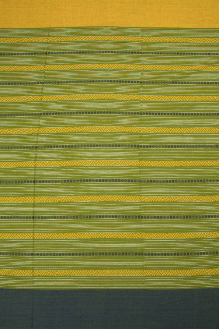 This Wasabi Green Handloom Dhaniakhali Cotton Saree features a unique Black & Yellow Stripes, Geometric Motifs, Ganga Jamuna Border and Striped Pallu design. Constructed from 100% Organic Cotton, the lightweight fabric is incredibly breathable for comfort and style. Ideal for special occasions, this piece utilizes traditional block print for a timeless look.
