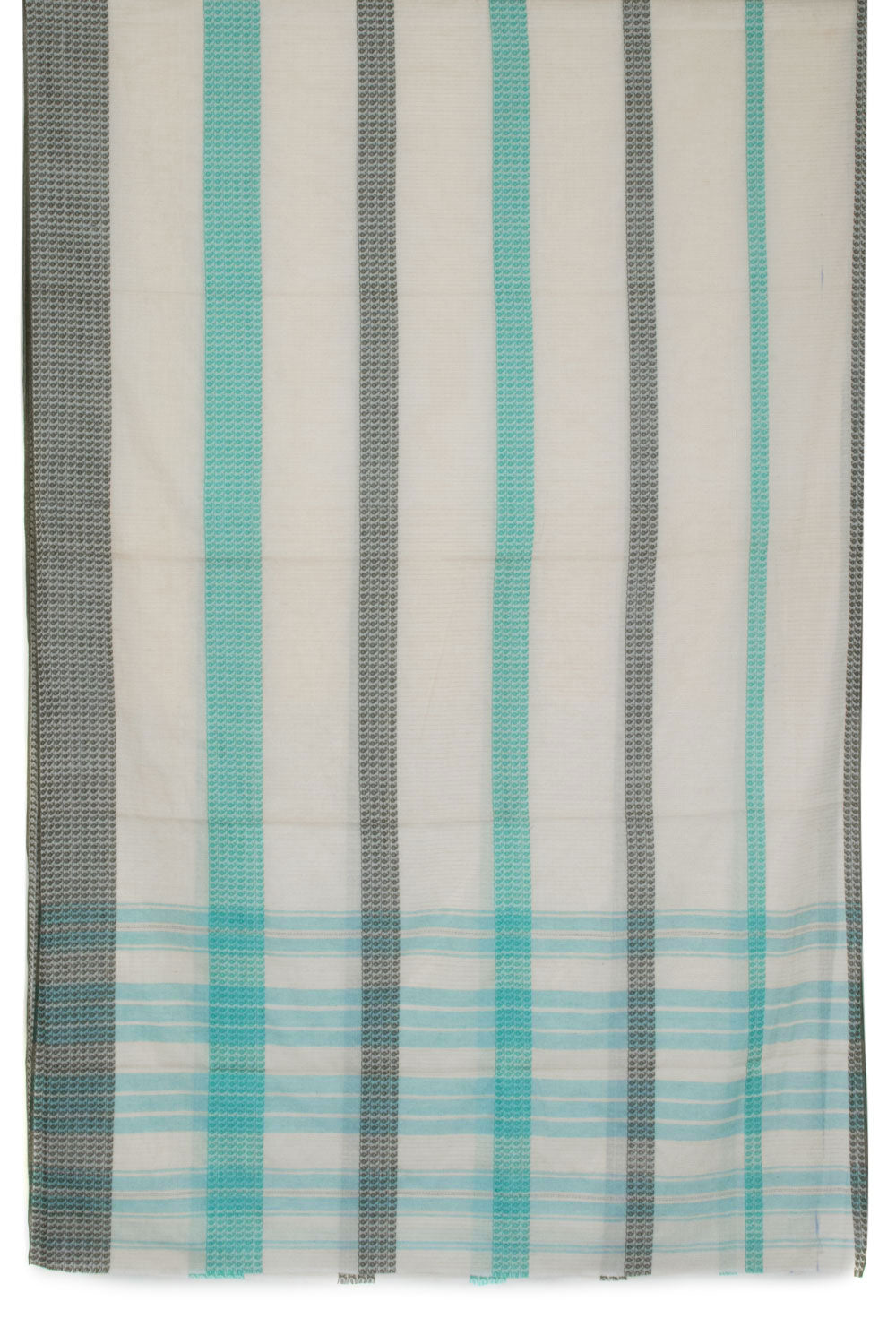 This White Handloom Dhaniakhali Cotton Saree features Blue & Black Stripes and Paisley Motifs along with a Striped Pallu. Crafted using traditional methods, it offers excellent quality, comfort, and durability for an everlasting look.