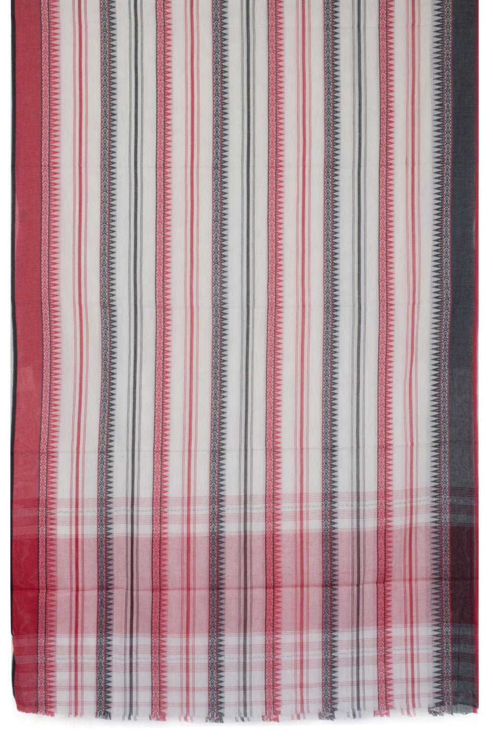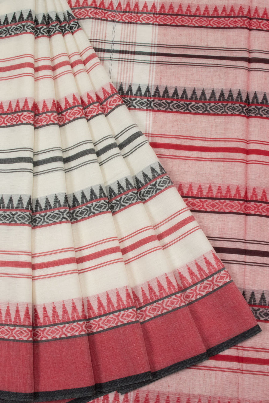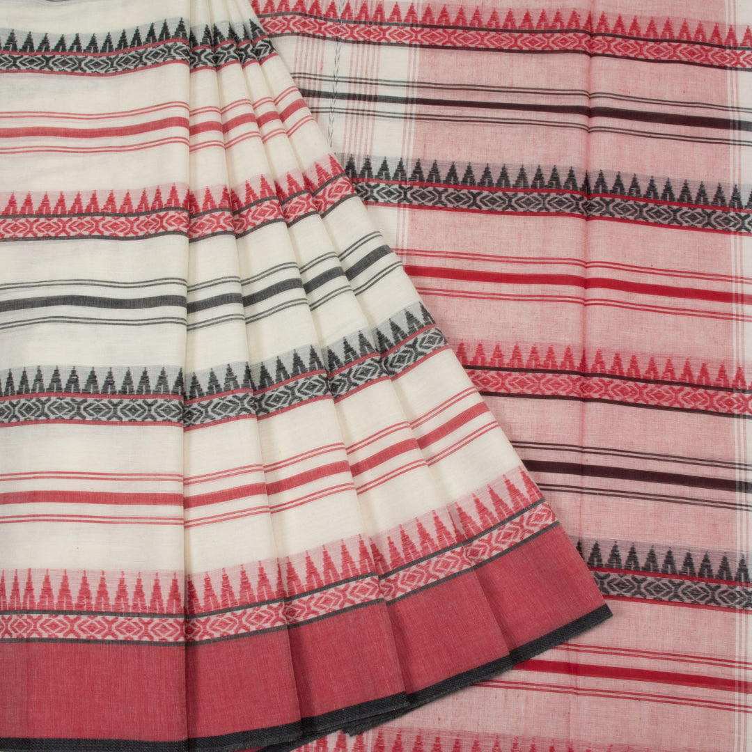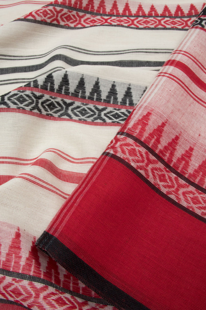 This White Handloom Dhaniakhali Cotton Saree features a Black & Red Stripes Design, Temple and Geometric motifs, Ganga Jamuna Border and Striped Pallu. Its lightweight and breathable fabric make it suitable for all-season wear and comfortable for any occasion.