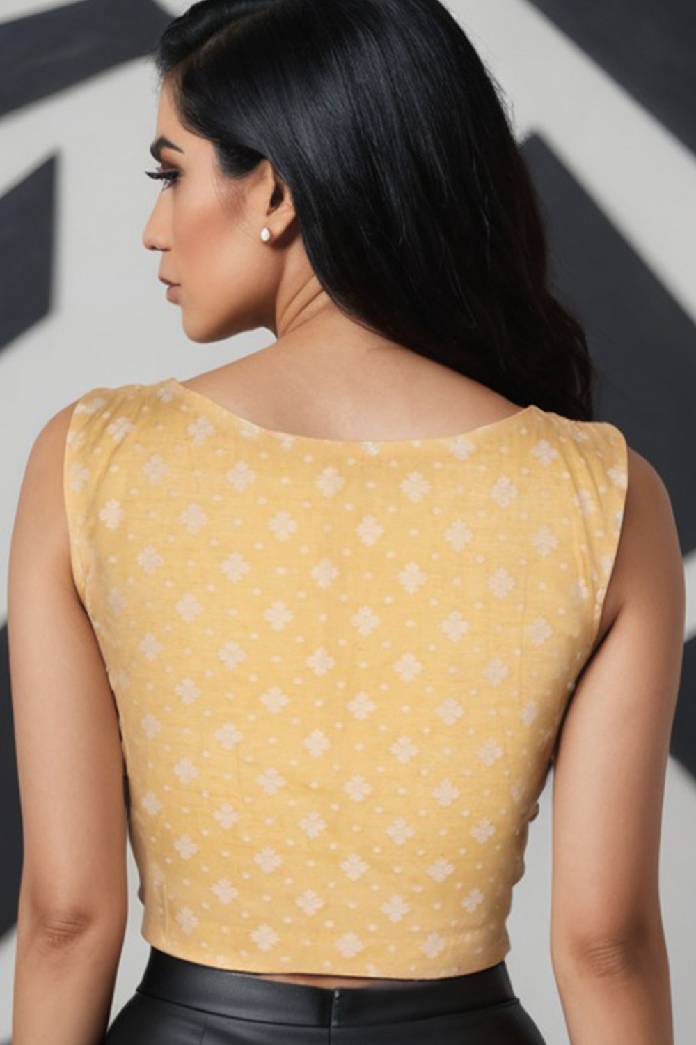 It’s the best of both worlds—light cotton comfort with the opulent look of Banarasi weaving. Whether you’re styling a silk saree or a casual drape, this blouse adds a festive twist that works for both day and evening occasions.
