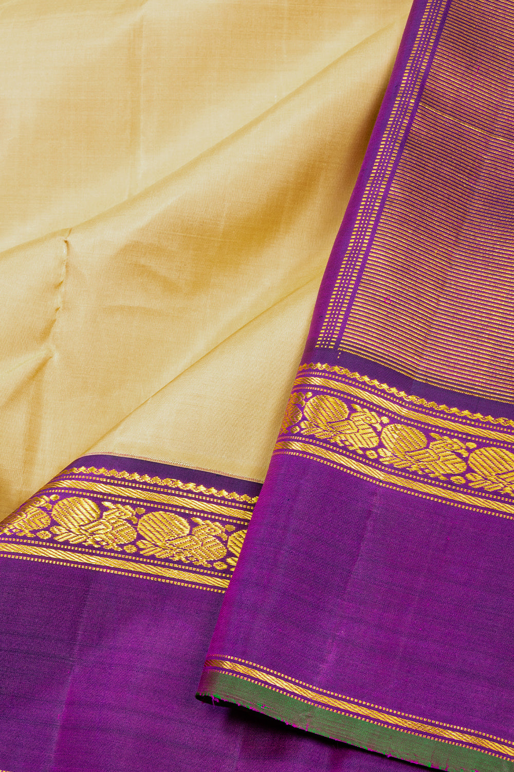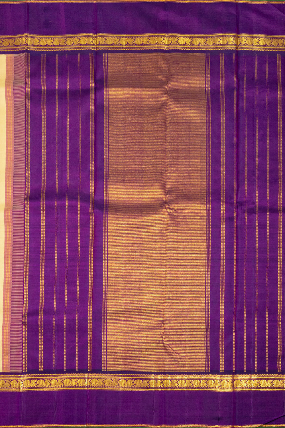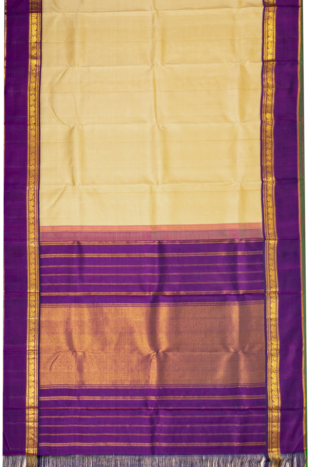 Pure Zari Craftsmanship: Traditional motifs like checks, paisleys, floral vines, and temple borders are woven with fine zari to enhance the saree’s opulence.