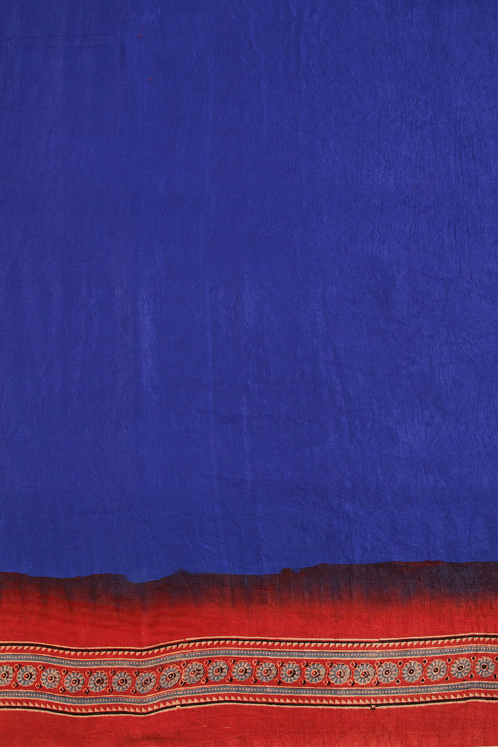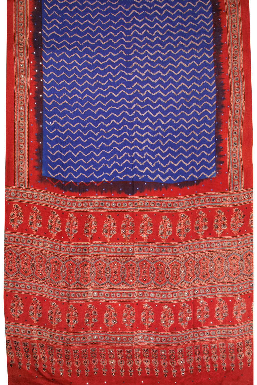 This gorgeous Blue Handcrafted Ajrakh Printed Bandhani Gajji Silk Saree 10068240 features Small Lehariya Patterns all over the body, with a Red Ajrakh Border and Paisley Patterned Pallu adorned with Mirror Work Embroidery. The saree also comes with a matching blouse featuring an Ajrakh Border.