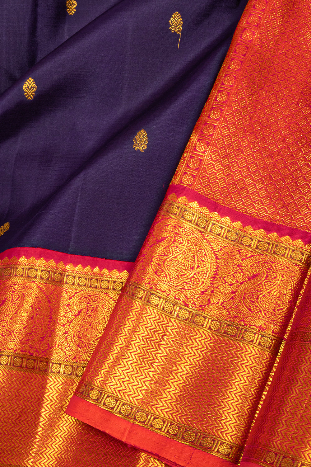 - Rich Color Contrasts – Signature Kanjivaram style featuring deep, bold hues.