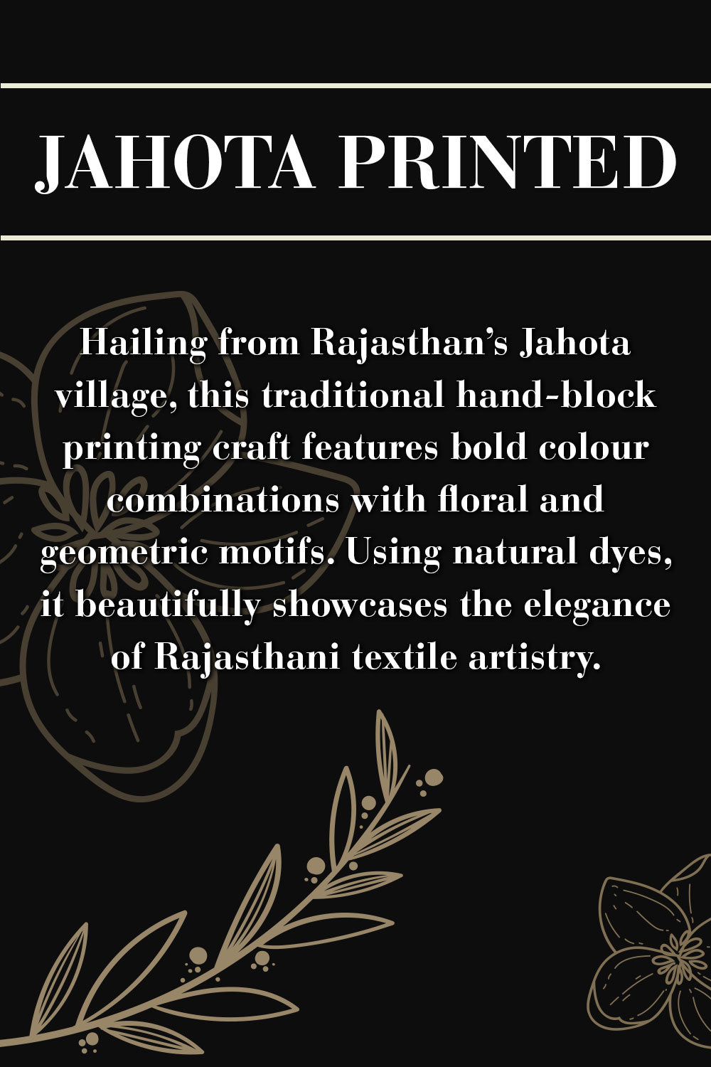 Jahota Printing is a traditional textile art from Jahota town in Rajasthan, renowned for its unique blend of heritage techniques. It combines Bagru Printing, the classic hand block printing of Rajasthan, with Syahi Begar, a style known for its striking use of red, black, and maroon natural dyes. The fusion of floral and geometric motifs, coupled with meticulous layering, gives Jahota prints their distinctive three-dimensional effect. Crafted on cotton, silk-cotton, and modal fabrics, Jahota textiles embody the vibrant spirit and artisanal mastery of Rajasthan.