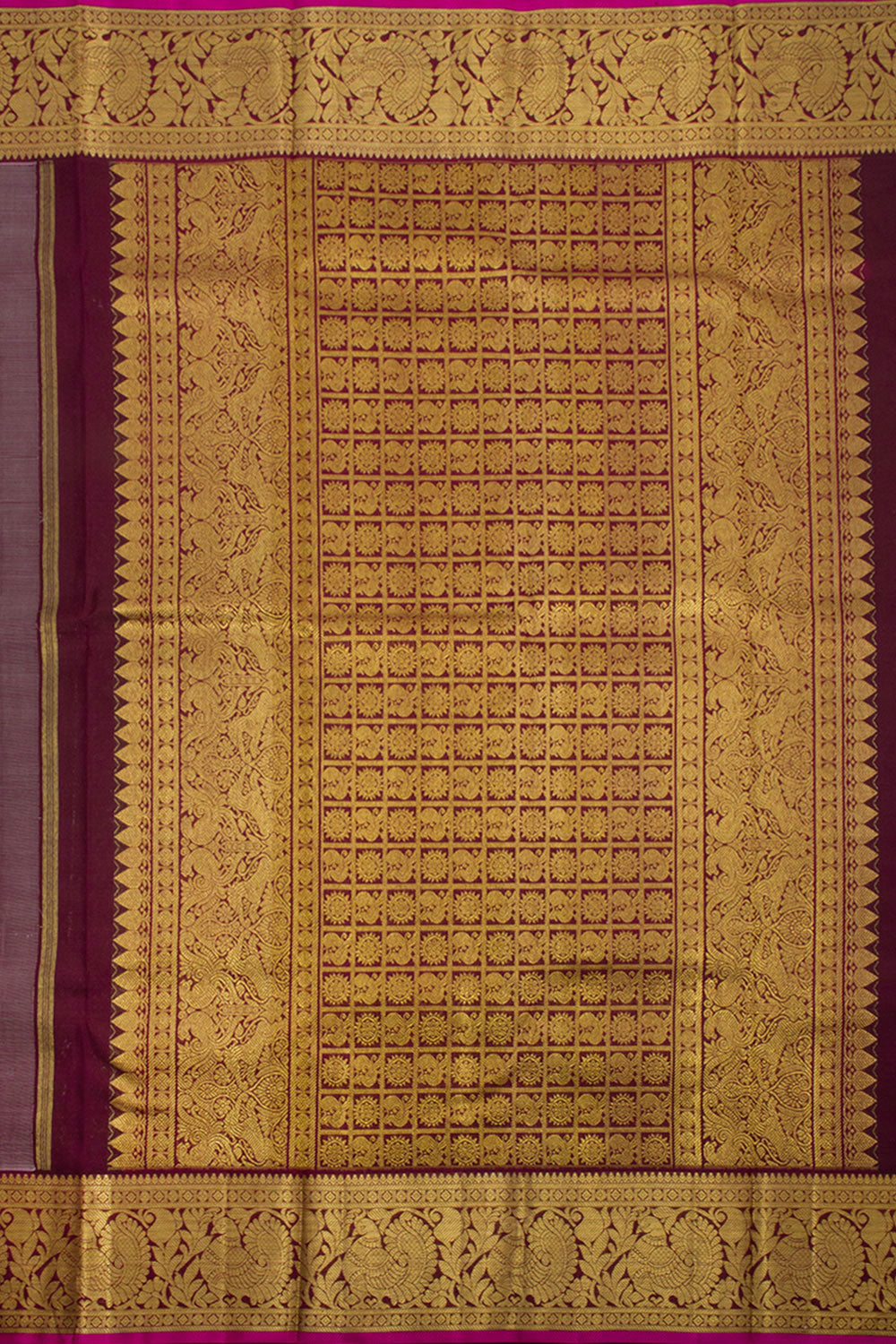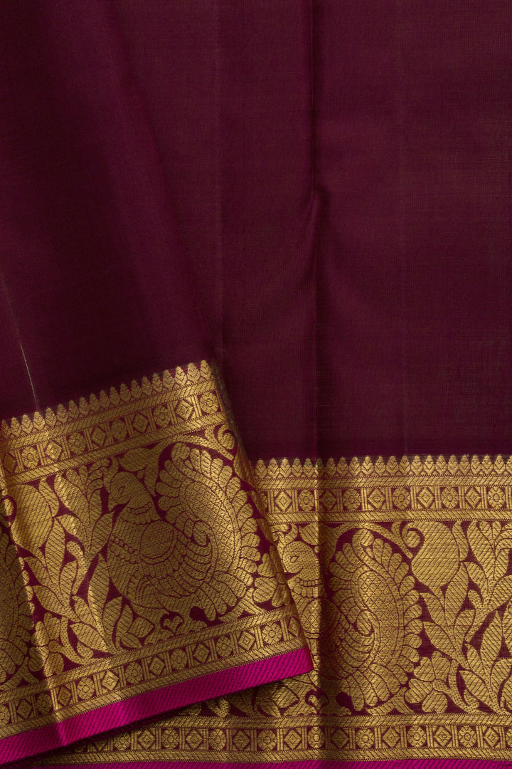 Make a statement in this exquisite Handloom Pure Zari Korvai Jacquard Kanjivaram Silk Saree. Crafted from pure silk and featuring intricate floral motifs across the body and a grand peacock motif border and pallu has peacock and rudraksha, this saree is sure to turn heads. Wear it with confidence and bask in the admiration.
