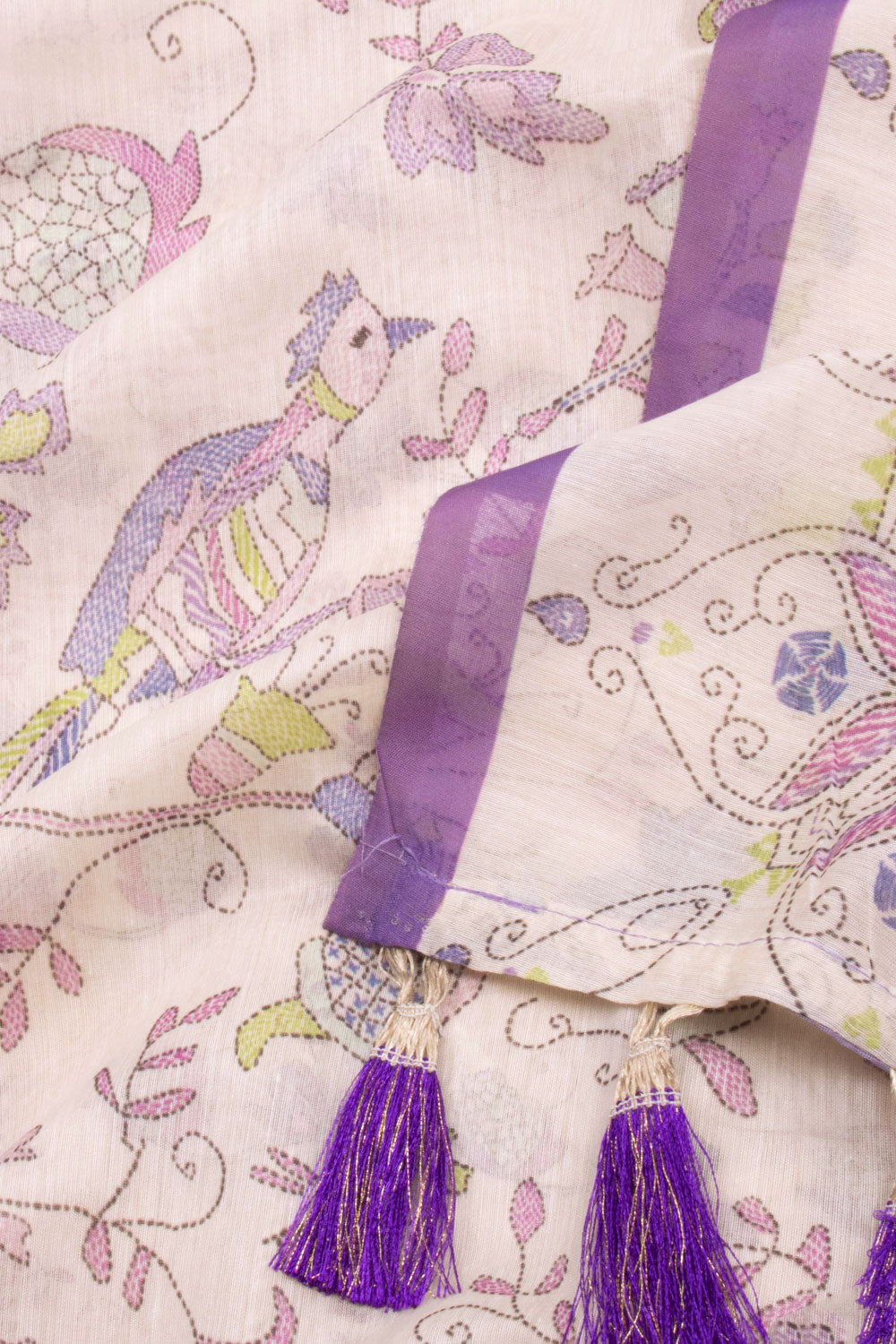 Cream Kalamkari Kantha Printed Malai Cotton Saree 10074905