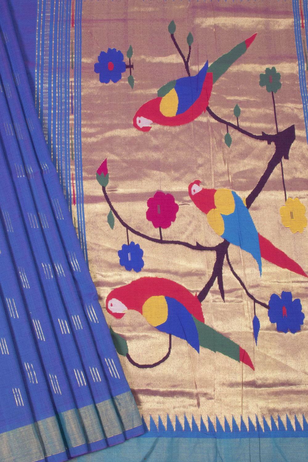 Deep Purple Handloom Traditional Paithani Cotton Saree with parrot Pallu This saree is a timeless classic, crafted using all natural materials and traditional weaving techniques, making it a perfect choice for any occasion. Its lightweight fabric and vibrant colors make it ideal for adding a touch of elegance to any outfit.