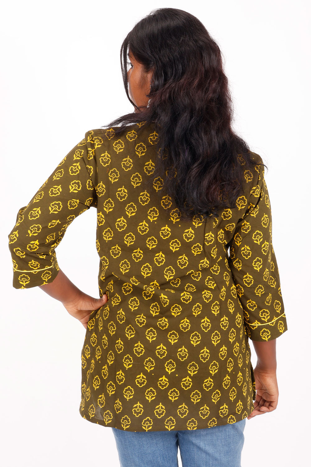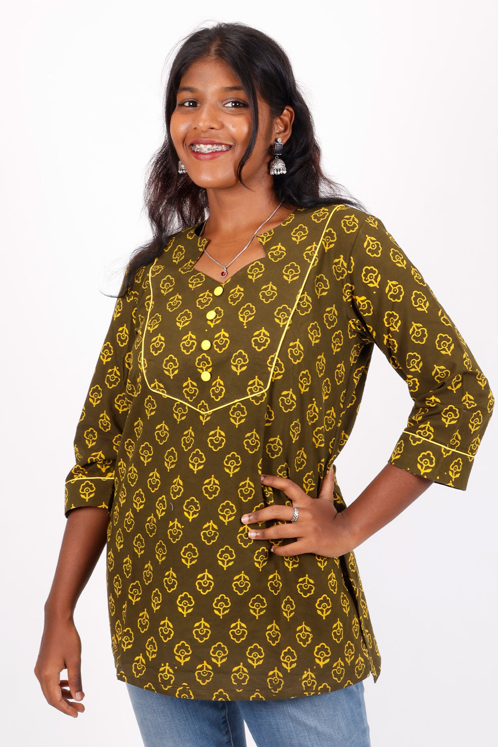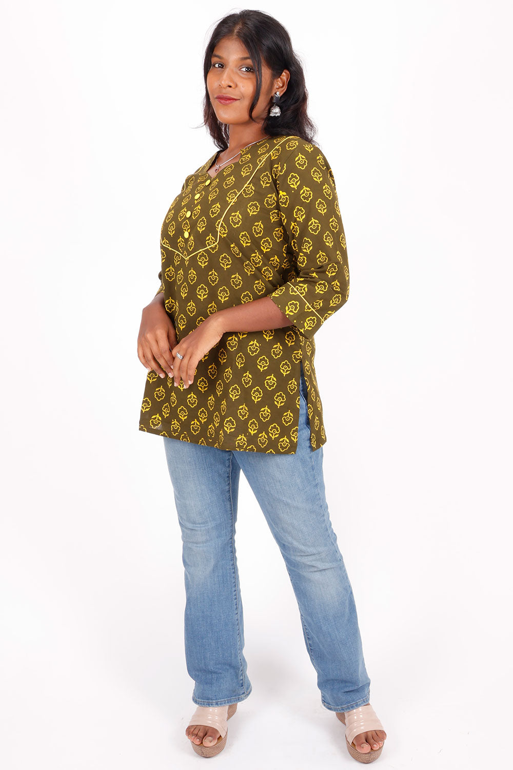 Introducing our Brown Hand Block Printed Cotton Short Top! Made with high-quality cotton, this top features a beautiful Hand Block Printed that adds a unique touch to your outfit. Look stylish and feel comfortable, all while supporting ethical and sustainable fashion. Upgrade your wardrobe today!