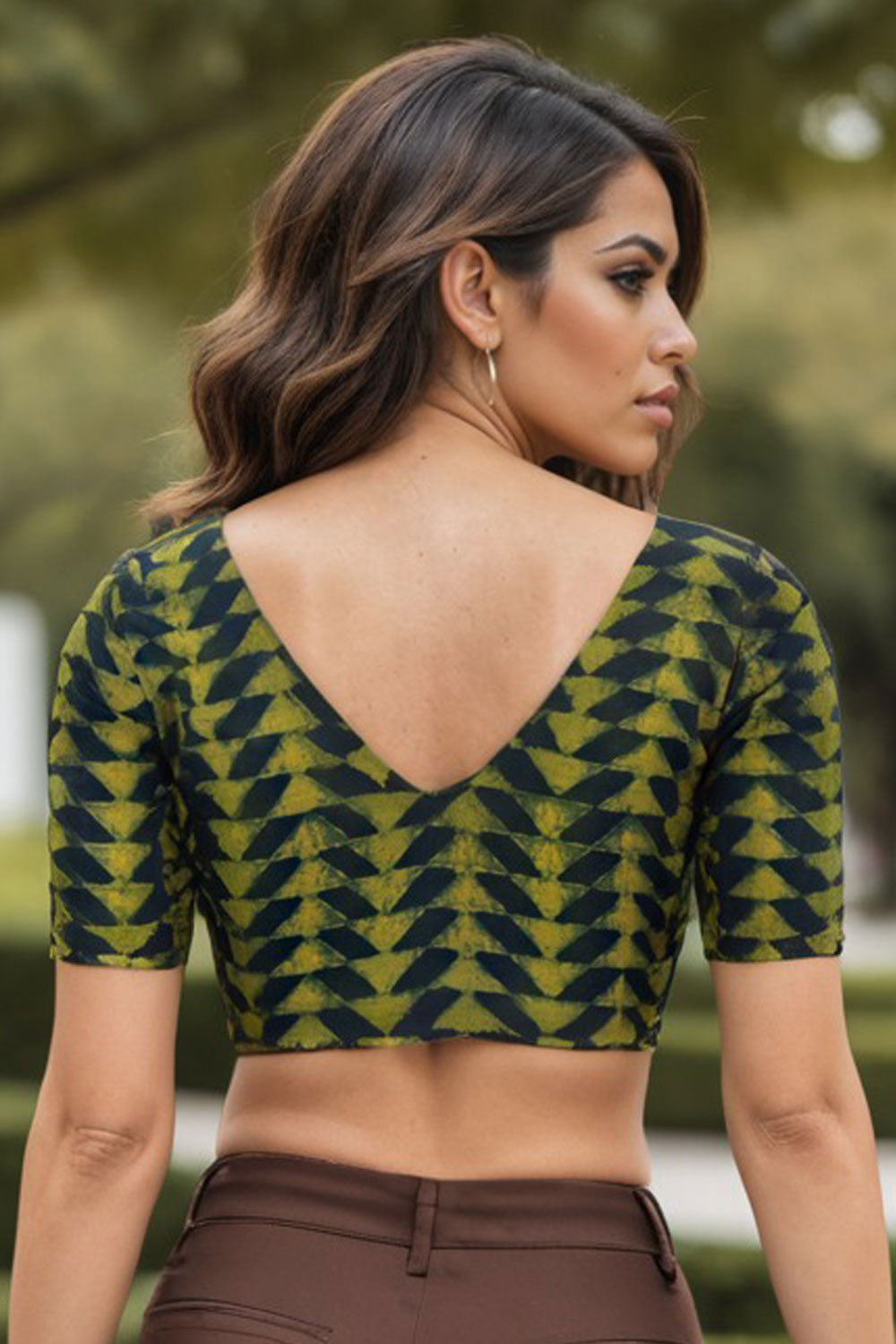Green Geometric Design Indigo Hand Block Print Cotton Blouse 10074589