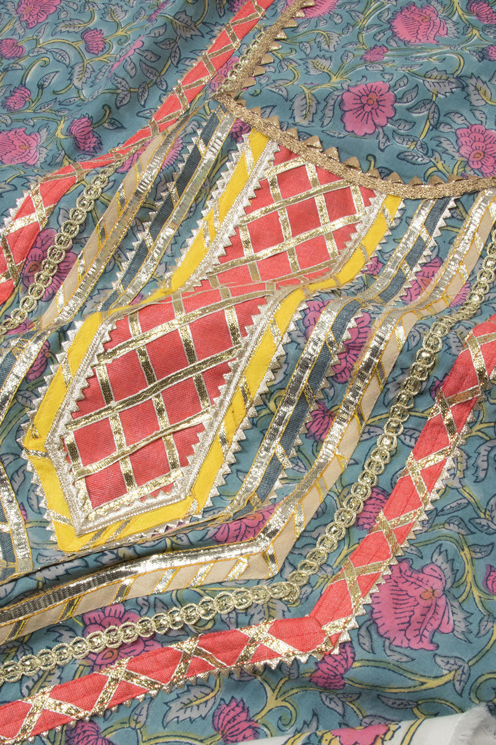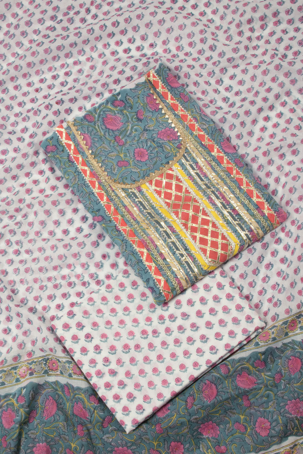 Introducing the Gotapatti Embroidered 3-piece Cotton Salwar Suit Material. Boasting an alluring embroidery work with a combination of traditional and contemporary designs, this set will bring an exquisite touch to your special occasion. Crafted with 100% cotton, this breathable and comfortable material is perfect for creating timeless looks.