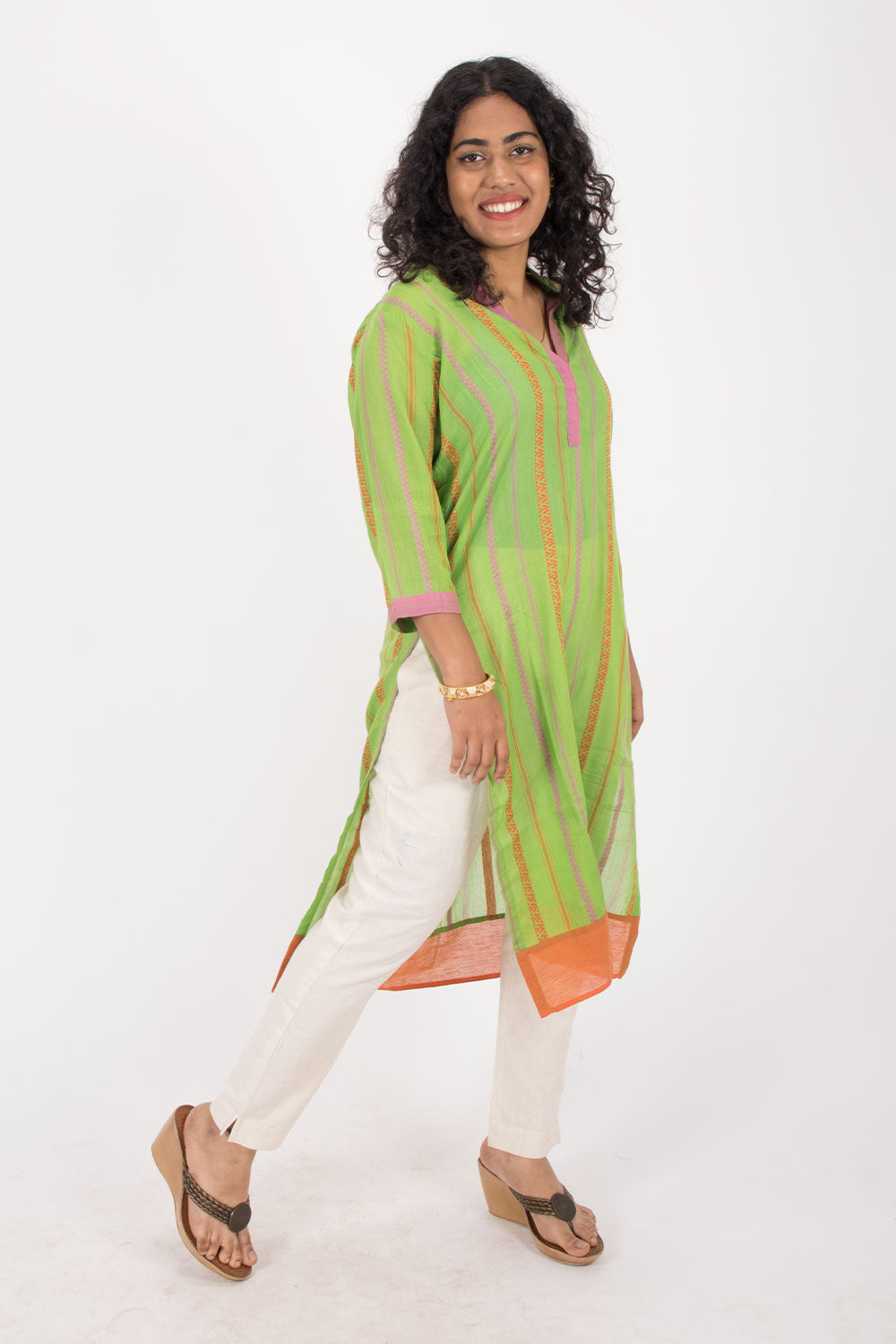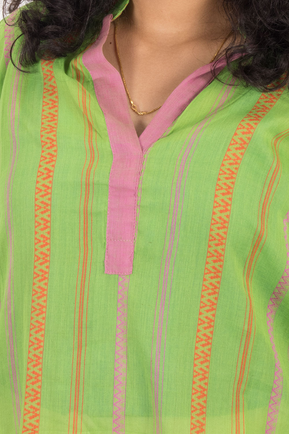 Experience the elegance of tradition with this Green Handcrafted Dhaniakhali Cotton Kurta. Crafted from breathable cotton, it offers comfort and style for everyday wear. Its vibrant pink hue pairs effortlessly with jeans or khaki pants, making it a versatile addition to your wardrobe. Embrace timeless craftsmanship while enjoying a modern, chic look.