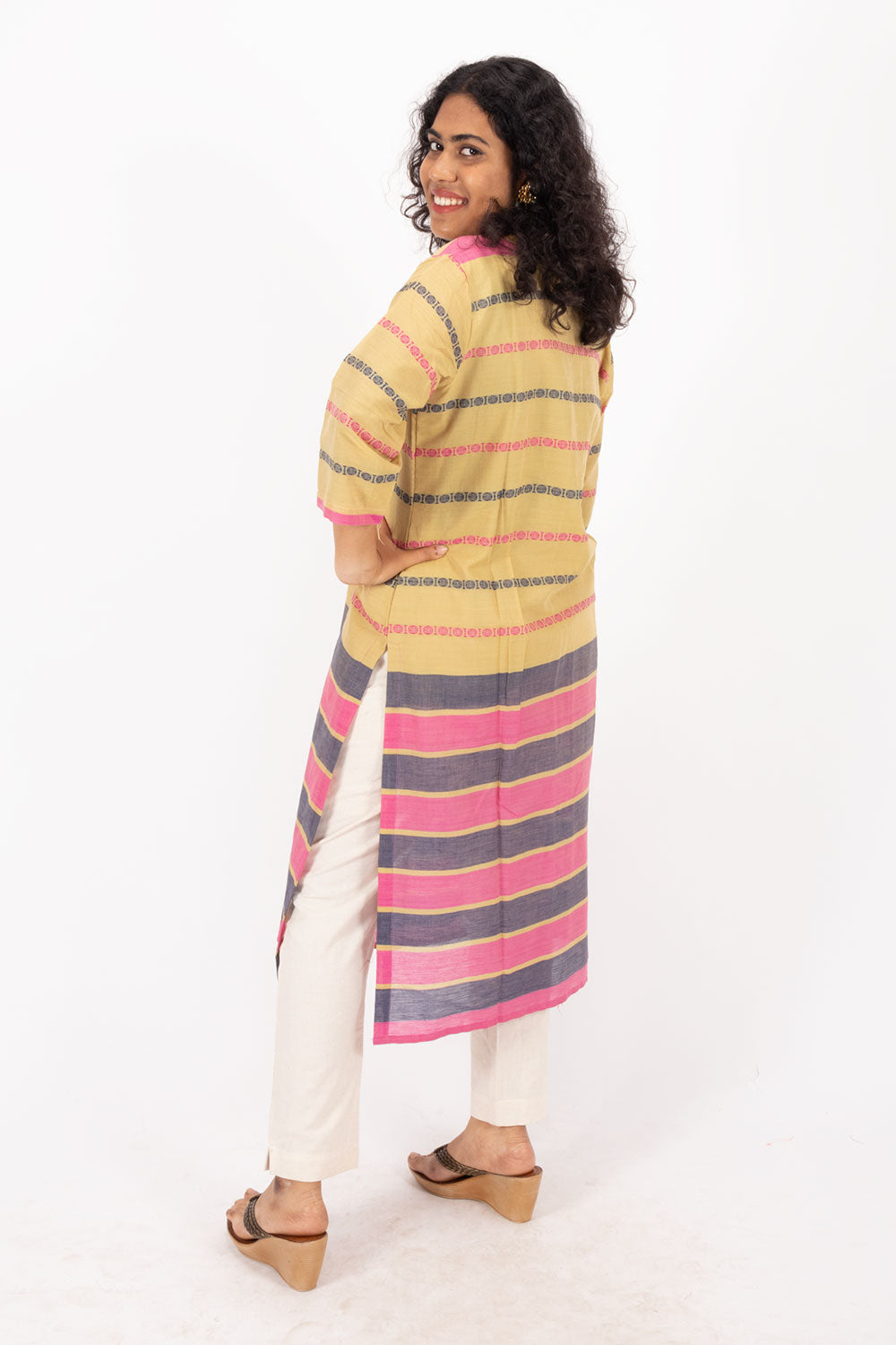 Bringing a fresh twist to tradition, Dhaniakhali Cotton Kurtas are crafted from the same high-quality cotton used for the iconic sarees. The result is a garment that’s soft, breathable, and exceptionally comfortable, with a crisp texture that holds its shape beautifully. These kurtas feature the distinctive borders and subtle patterns characteristic of Dhaniakhali weaves, giving them a unique and eye-catching appeal. Perfect for summer wear, they blend Bengali weaving heritage with contemporary styling, making them a standout choice for those who love something different and distinctive.
