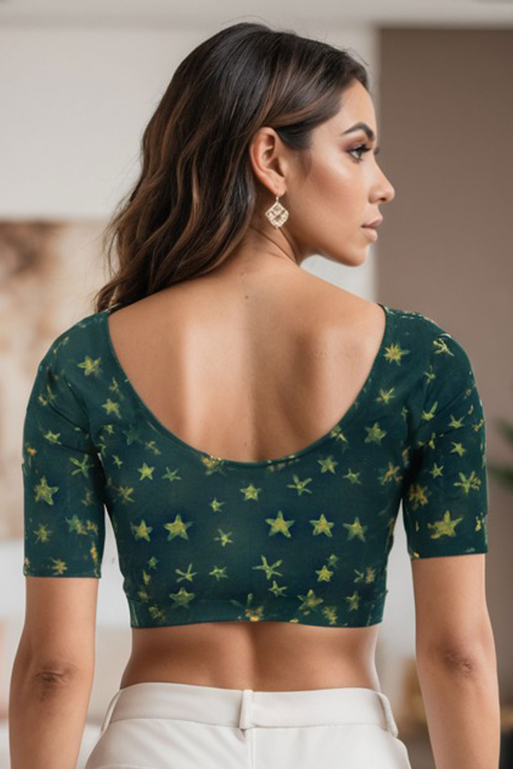 Green Star Motif Indigo Hand Block Print Cotton Blouse 10074587