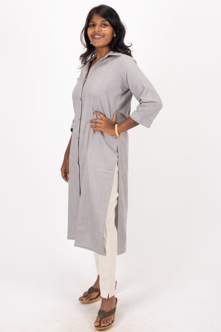 Grey Handcrafted Solid Style Oxford Cotton Kurta 10074337