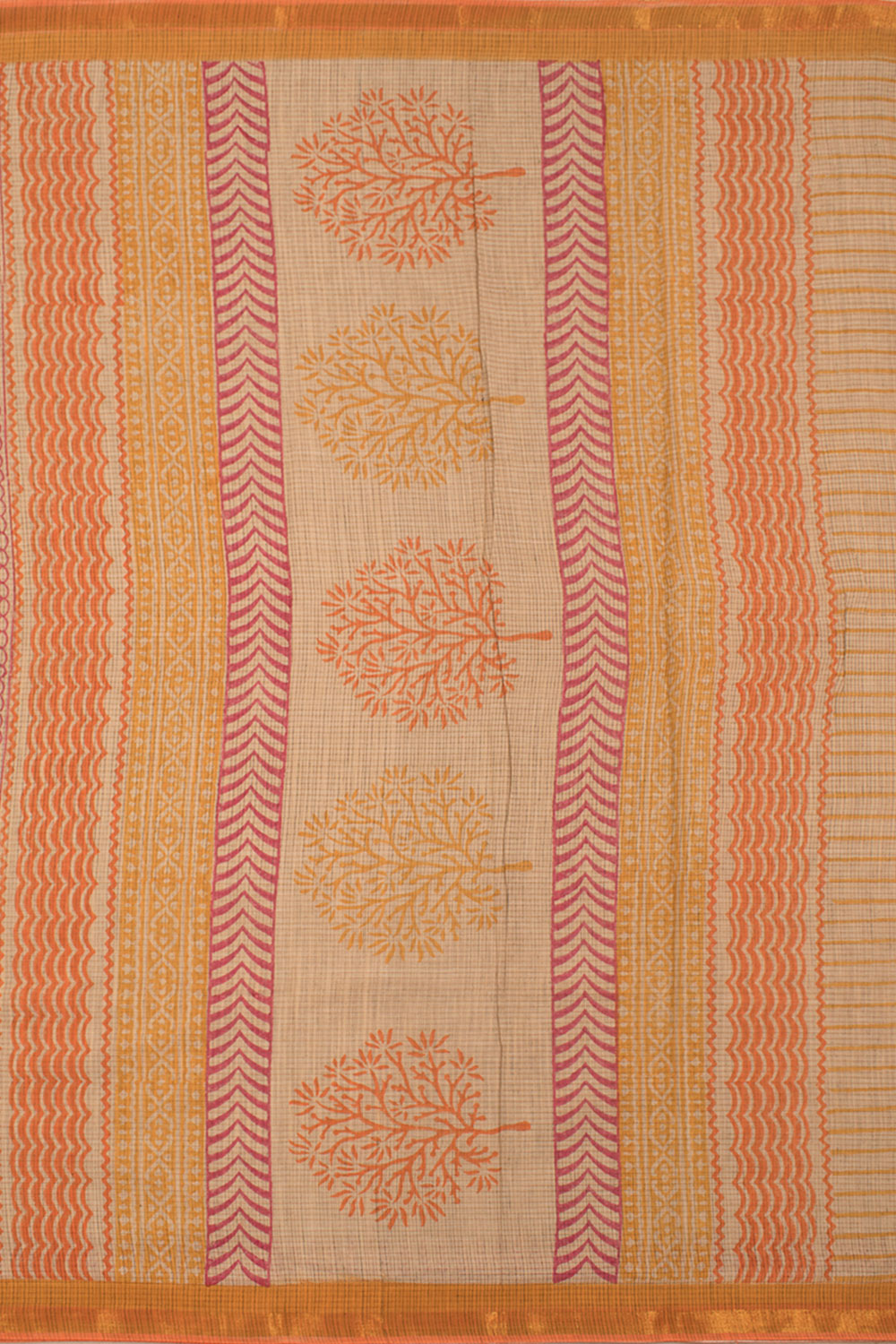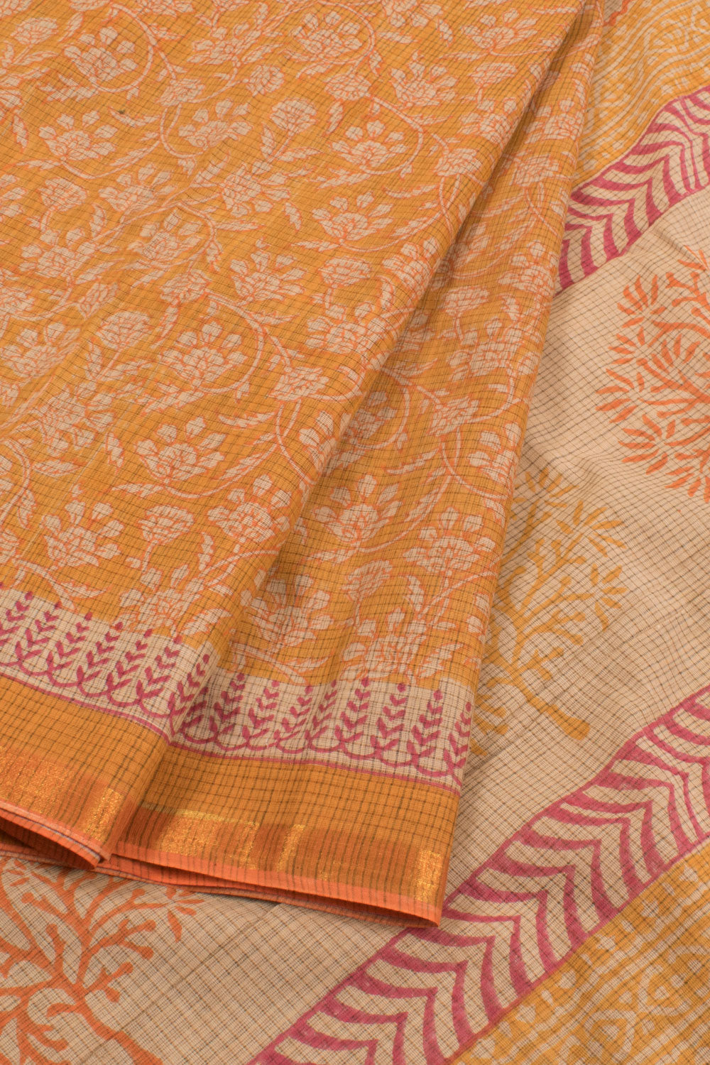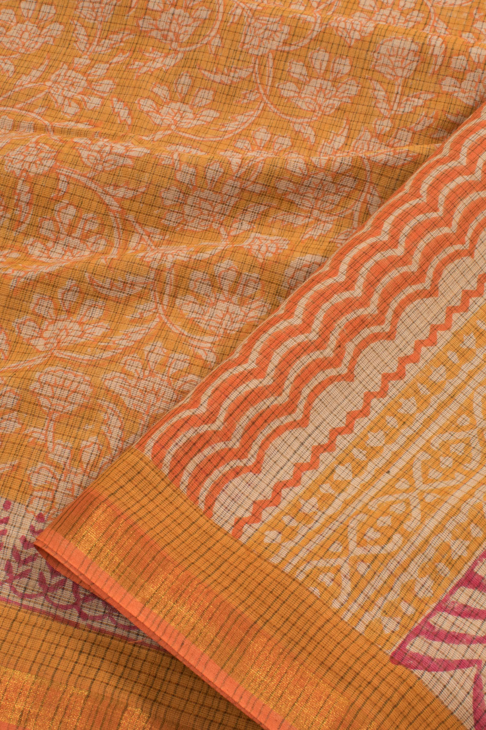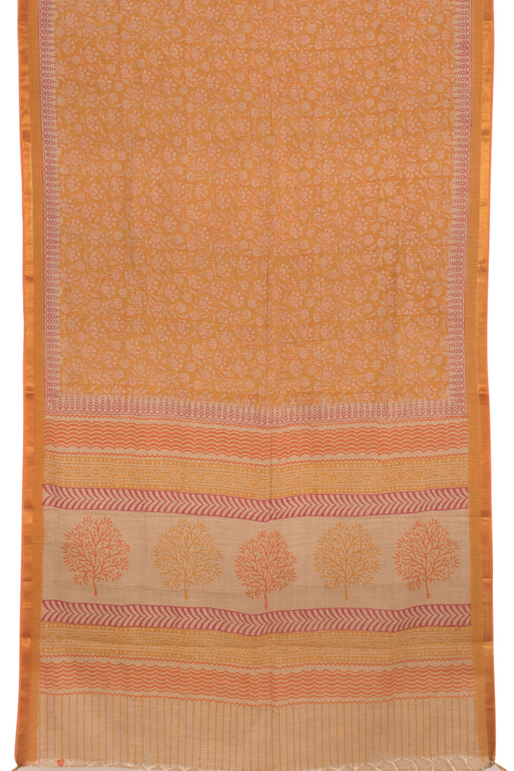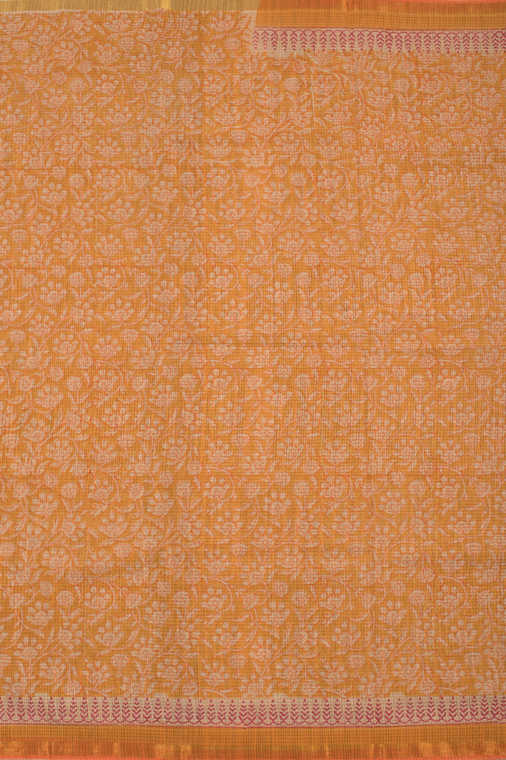 Hand Block Printed Khadi Cotton Saree with Floral Motifs and Zari Border 10059306