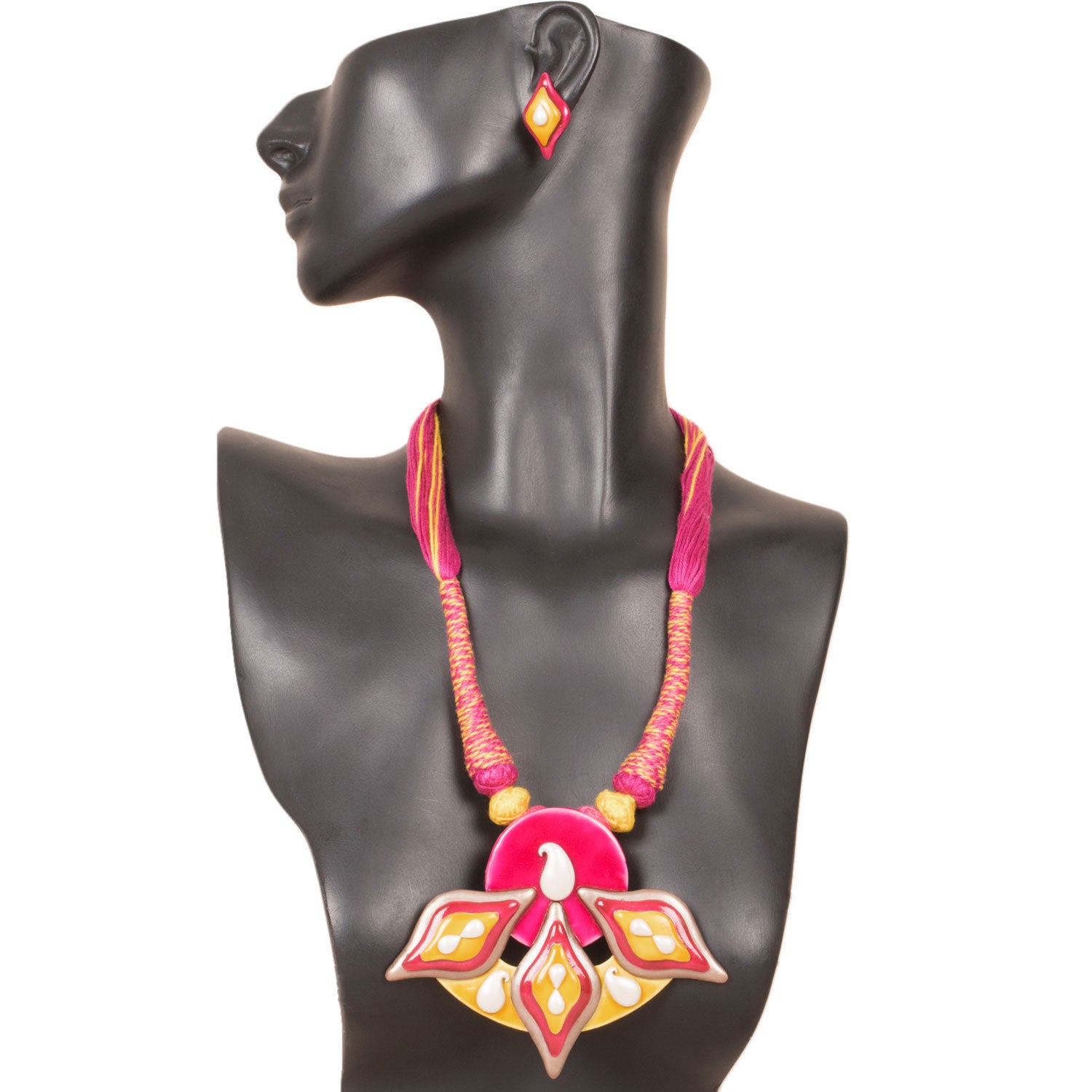 Hand Crafted Trinayan Ceramic Necklace With Thread Binding & Earring Set 10021799p