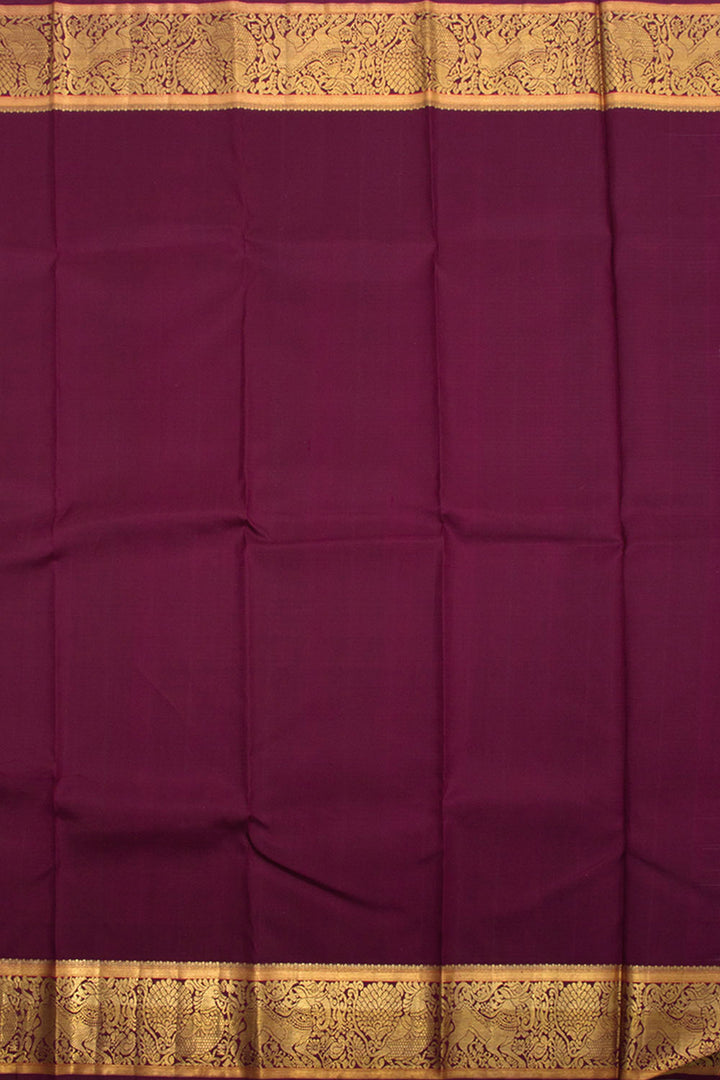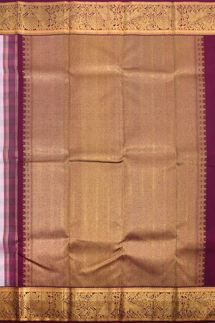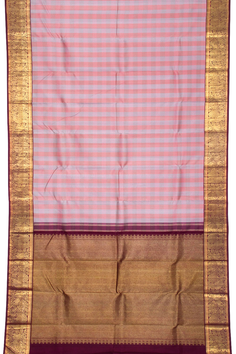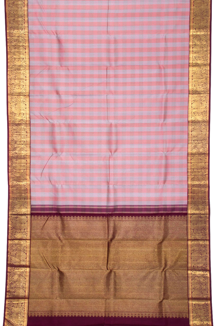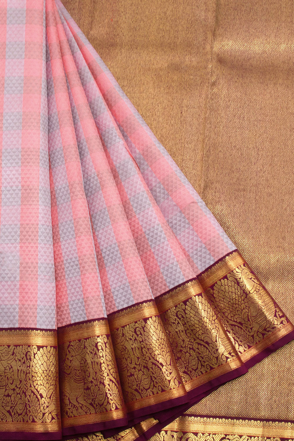 This beautiful Rosebud Pink and Quill Grey Checked Kanjivaram Pure Zari Saree features an exquisite Araimaadam Jacquard design in the body. The Korvai Border has a stunning Yaazhi design and the Tissue Pallu adds a rich and luxurious touch. Perfect for any special occasion.