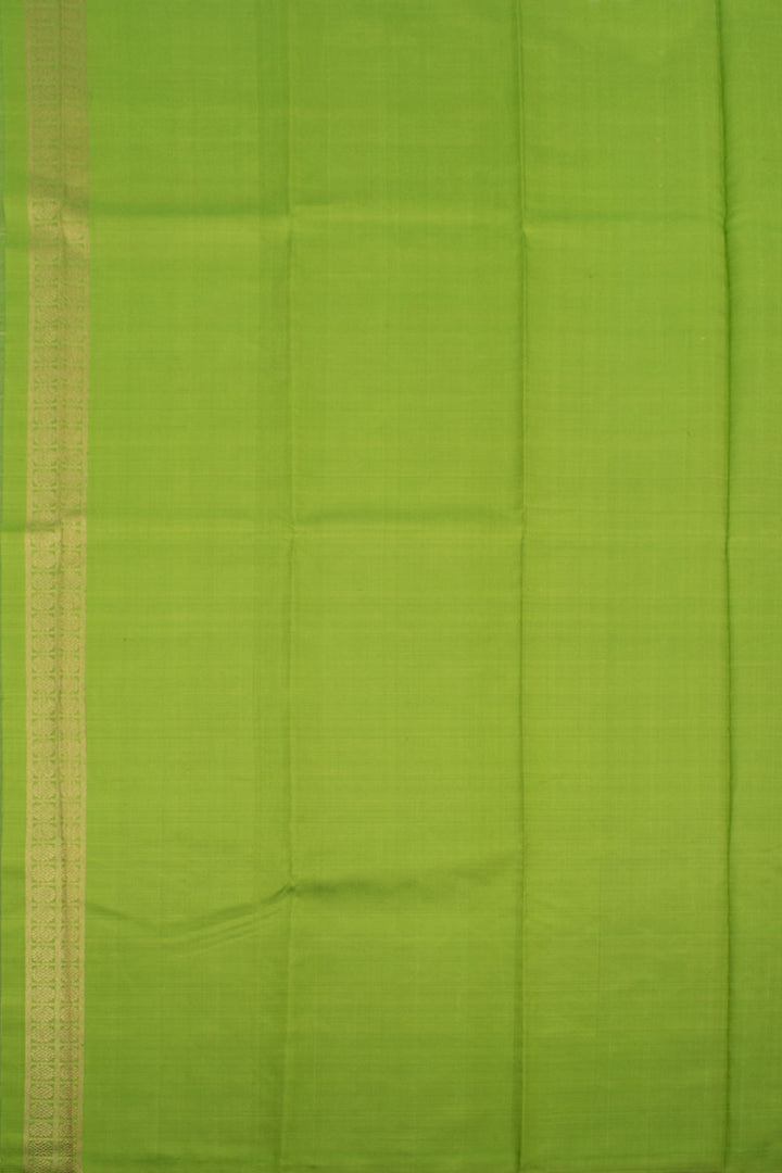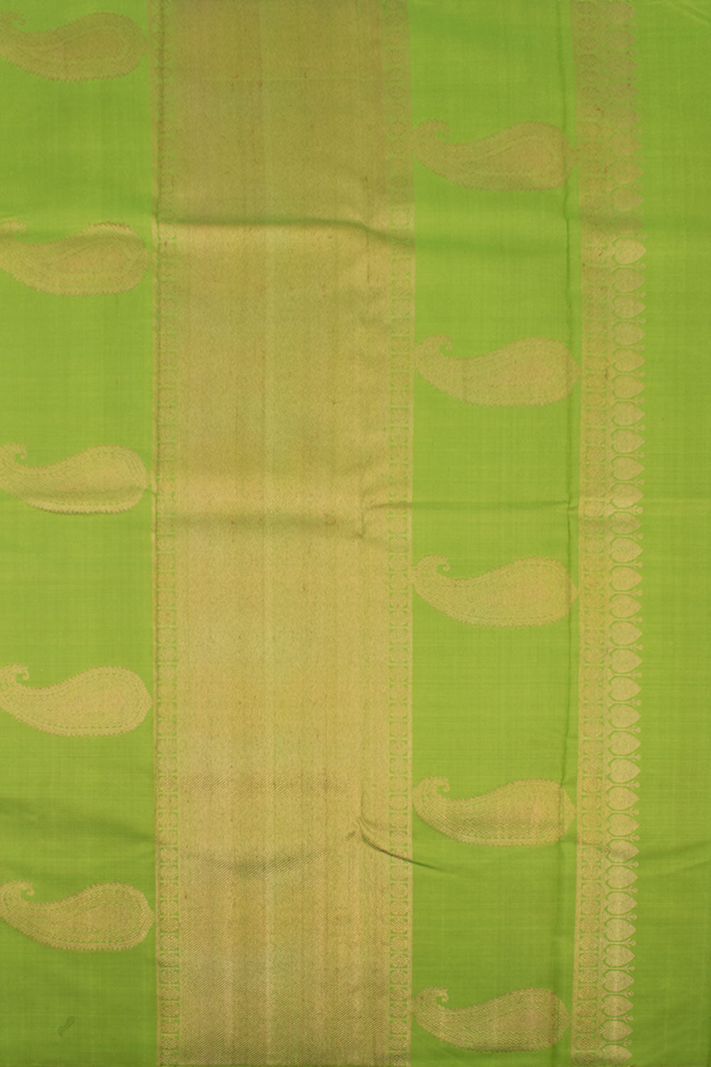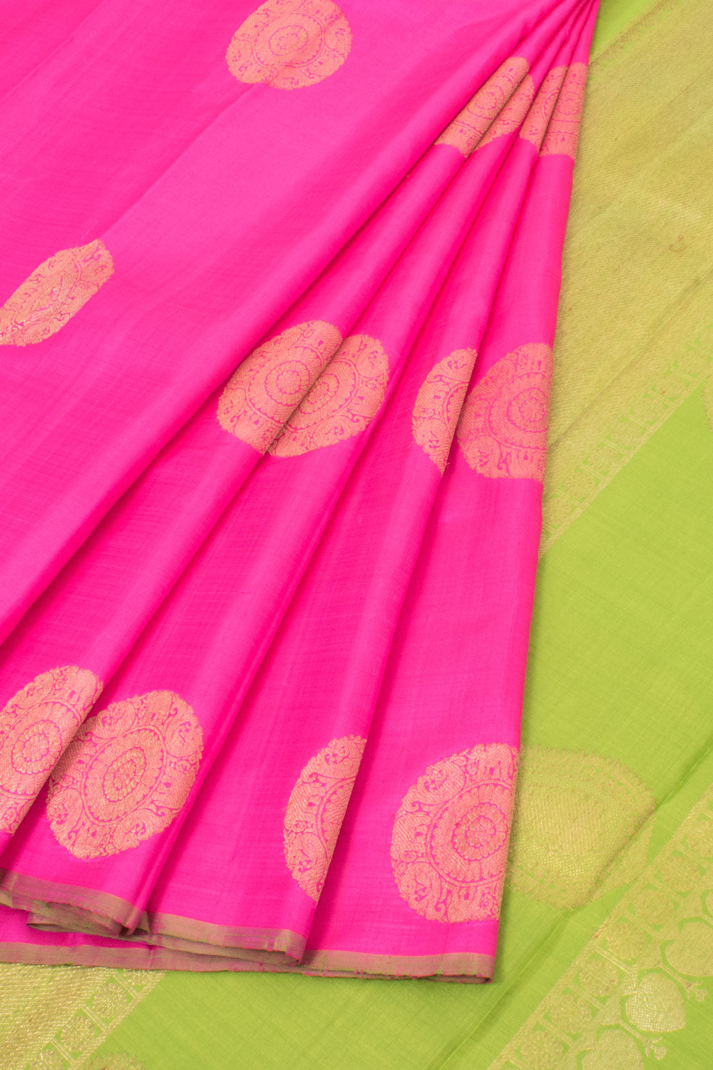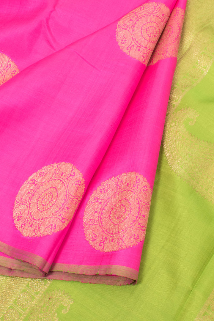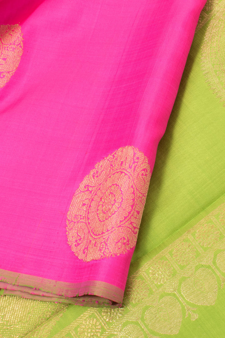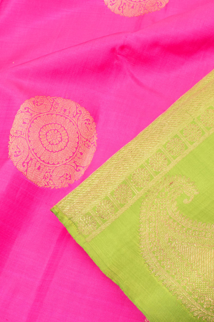This dazzling Hot Pink Pure Zari Borderless Kanjivaram Silk Saree features bold circular motifs of peacocks and elephants, adding a touch of regal elegance to the design. The contrasting green pallu is adorned with paisley motifs and a band of shimmering zari, bringing together a perfect combination of traditional and modern styles. Don't miss out on this stunning saree with a contrast blouse!