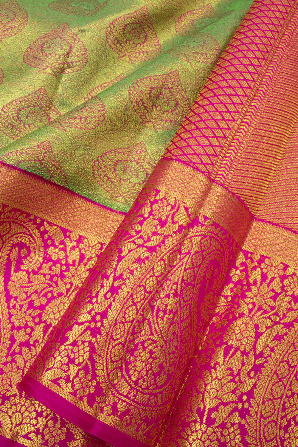 Crafted from a luxurious Pure Zari Jacquard Kanjivaram Silk, this Light Olive Green Saree boasts Flora Motifs, a contrast Floral Border, and Diamond Motifs Palliu. For long-lasting wear, this timeless design features superior craftsmanship. Completing the look is a Contrast Blouse, for a luxurious drape that will ensure you can enjoy this item for years to come.