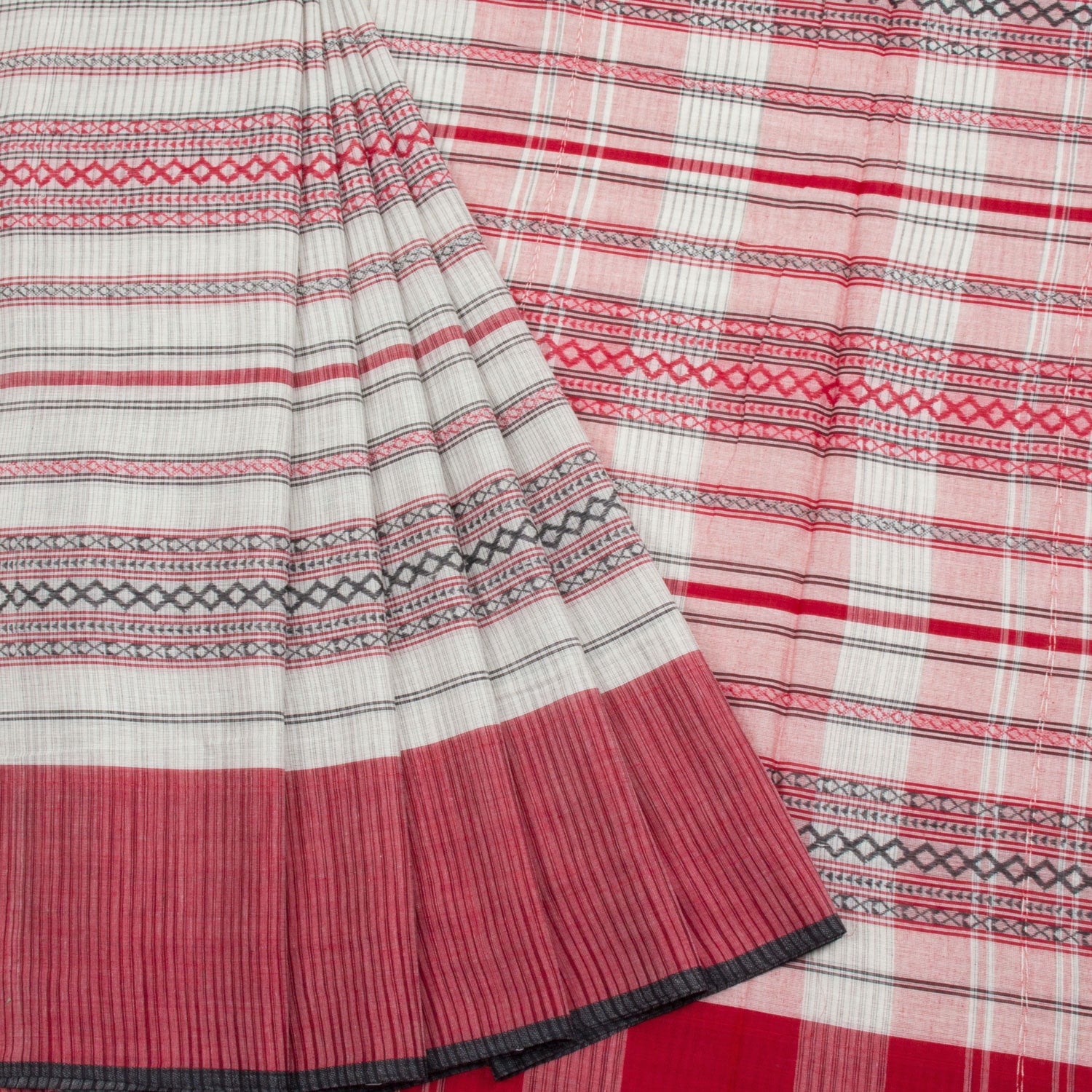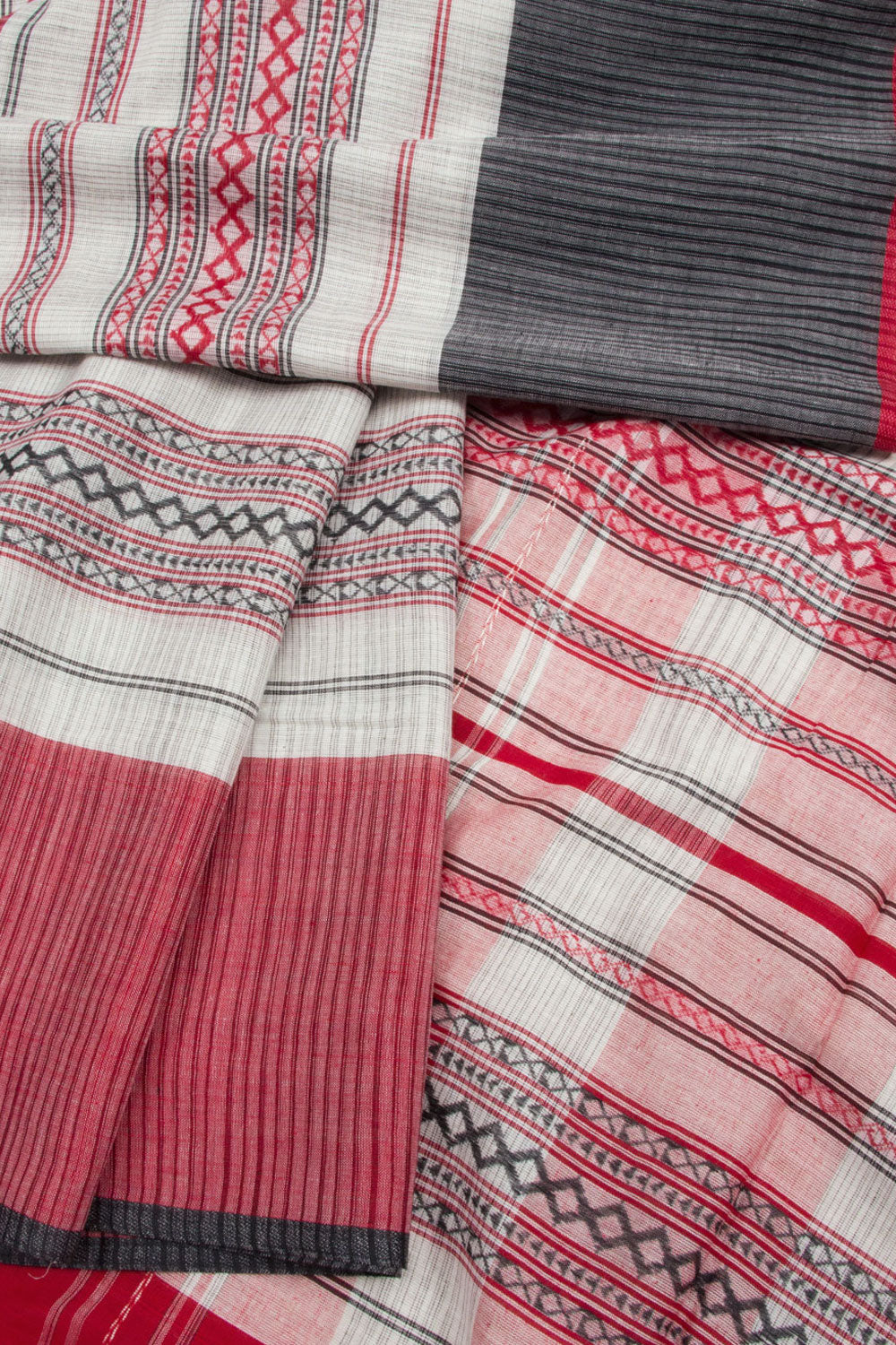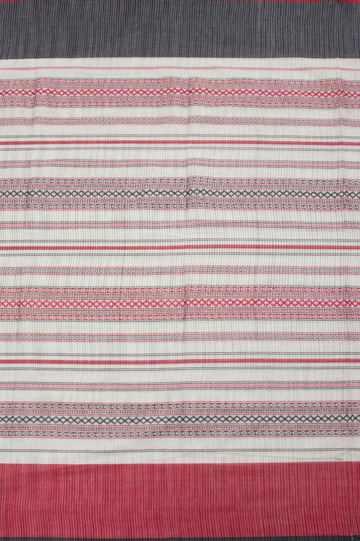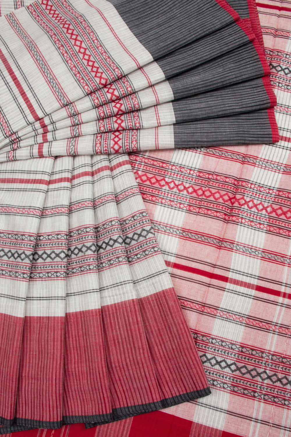 White Handloom Dhaniakhali Cotton Saree with diamond stripes design, contrast border and striped pallu. This saree is handwoven in West Bengal, using locally sourced cotton. It is lightweight and breathable for all-day comfort.