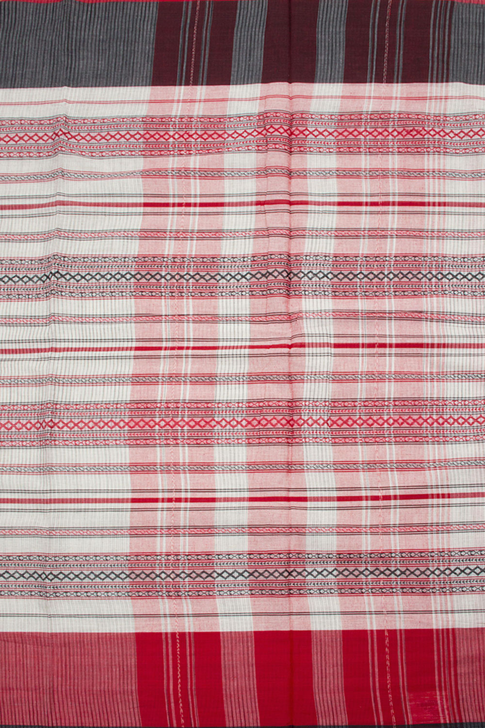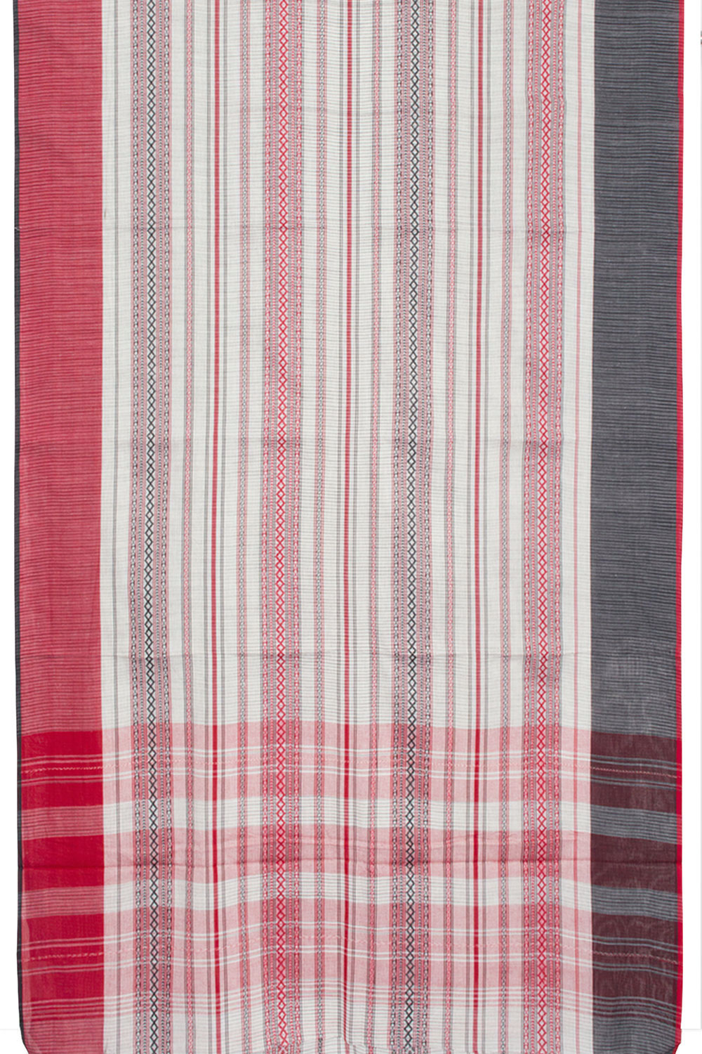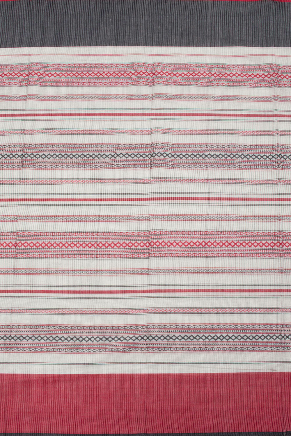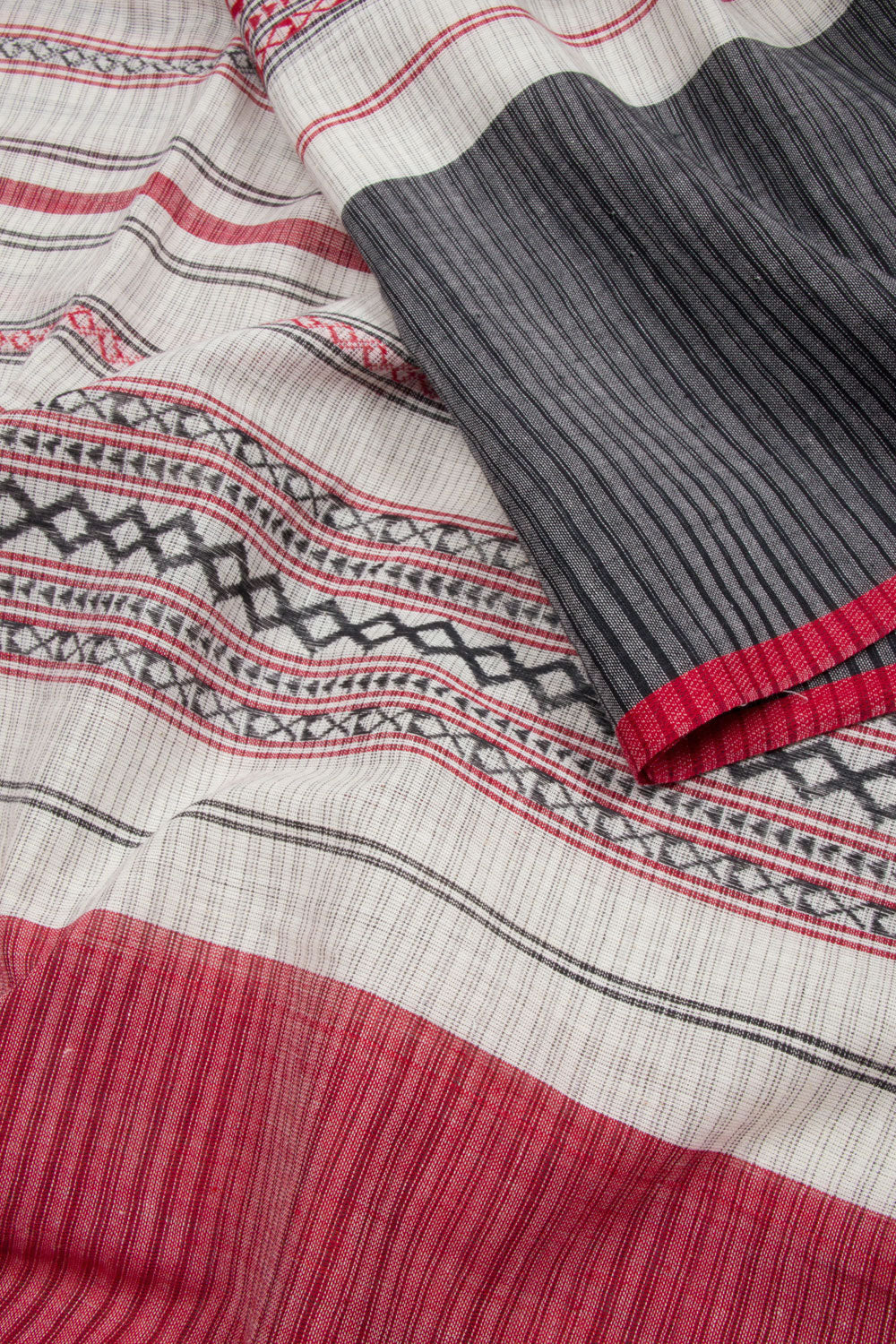 White Handloom Dhaniakhali Cotton Saree with diamond stripes design, contrast border and striped pallu. This saree is handwoven in West Bengal, using locally sourced cotton. It is lightweight and breathable for all-day comfort.