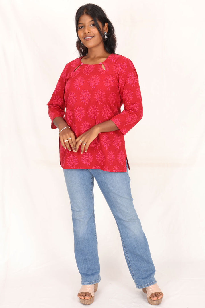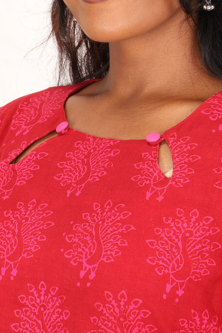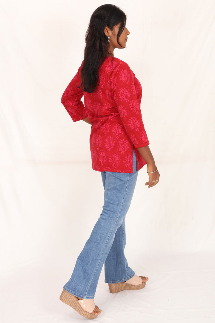 Experience vibrant elegance with this Maroon Hand Block Printed Cotton Kurti. Crafted from breathable cotton, it offers comfort and style for everyday wear. The intricate hand block prints add a unique, artisanal touch, making it perfect for casual outings or festive occasions. Embrace tradition with a modern flair and elevate your wardrobe effortlessly.