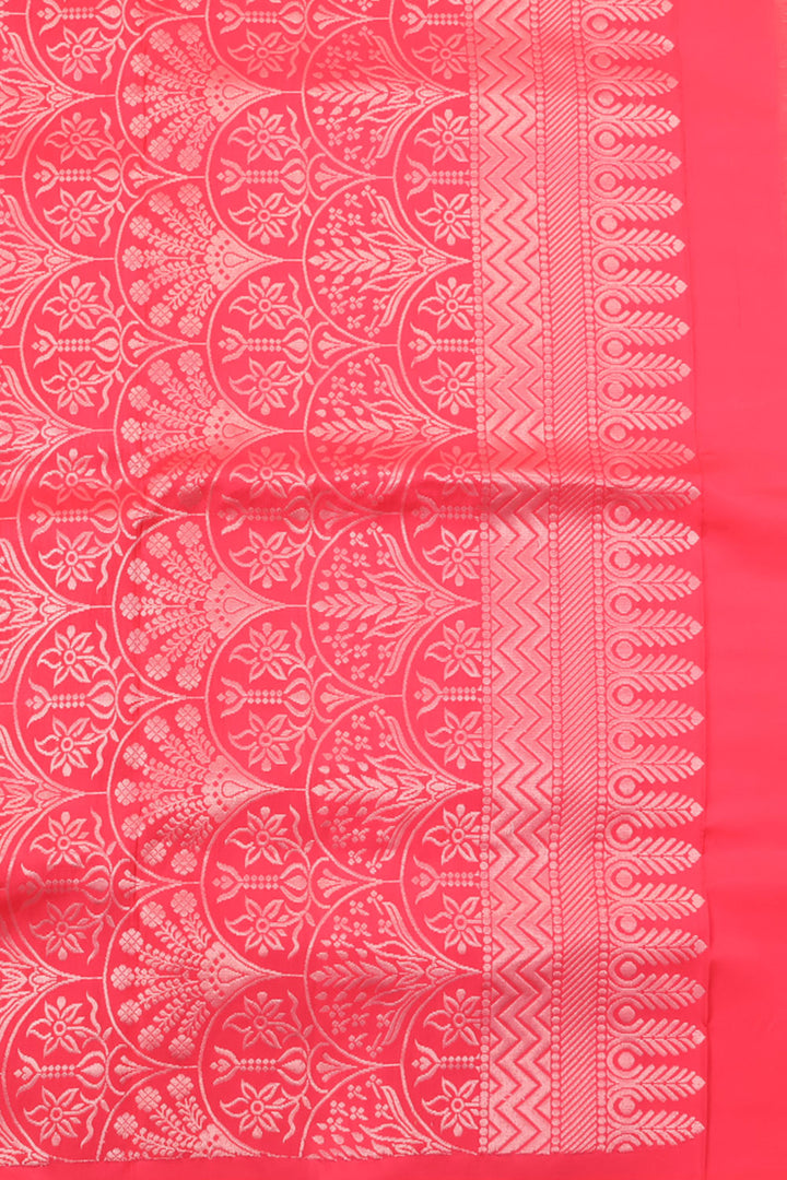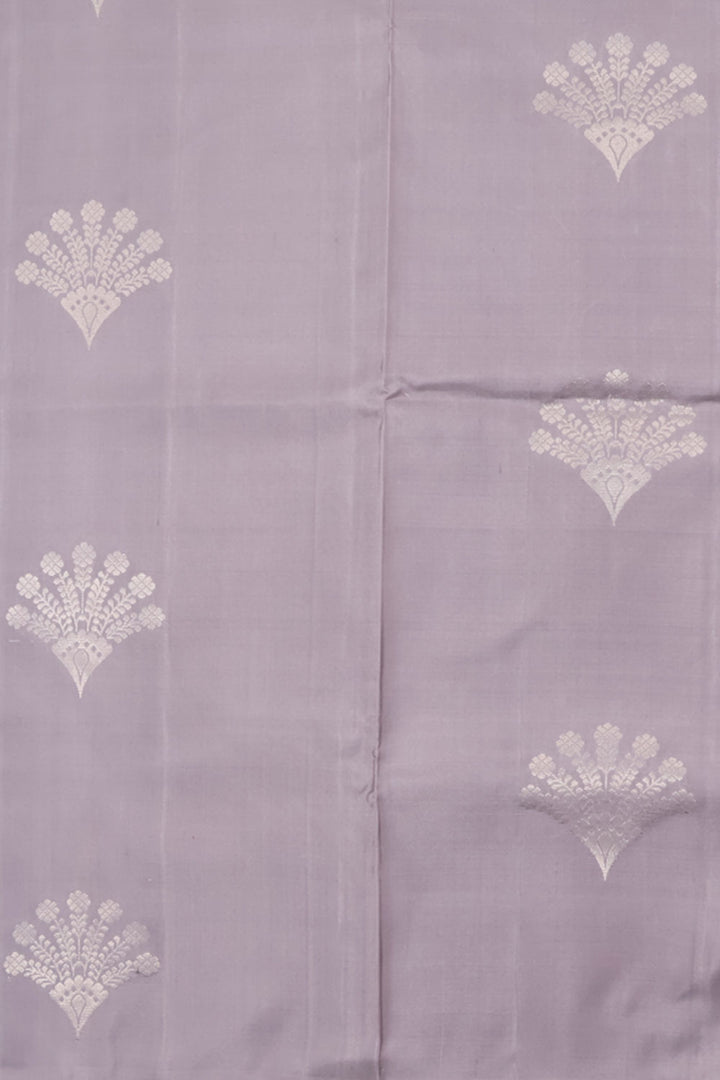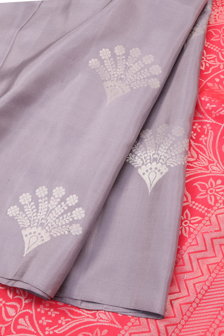 Exquisite Metal Grey Borderless Kanjivaram Soft Silk Saree: A Must-Have for the Fashion-Forward Woman! This handloom creation features beautiful Silver Zari Floral Motifs on the body, while the striking Rose Pink Pallu with Silver Zari Motifs adds a pop of contrast. Complete the look with the included rosey pink blouse. Elevate your style with this demure yet elegant saree now!