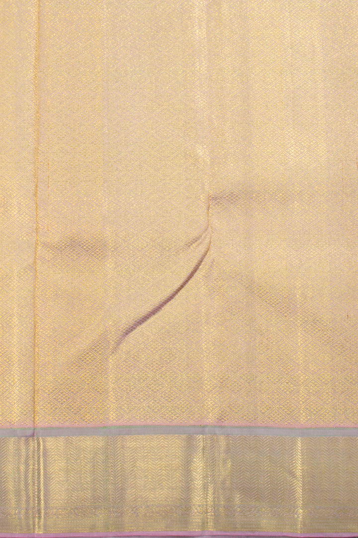 This Pista Green Pure Zari Kanjivaram Silk Saree is perfect for brides looking for a pastel saree. With its handloom Kanjivaram silk construction, this saree contains a Kodi Mango design in Zari on the body and a Vanki design and diamond design on the Lavender border. Embodying luxury and extravagance, it's sure to make a statement.
