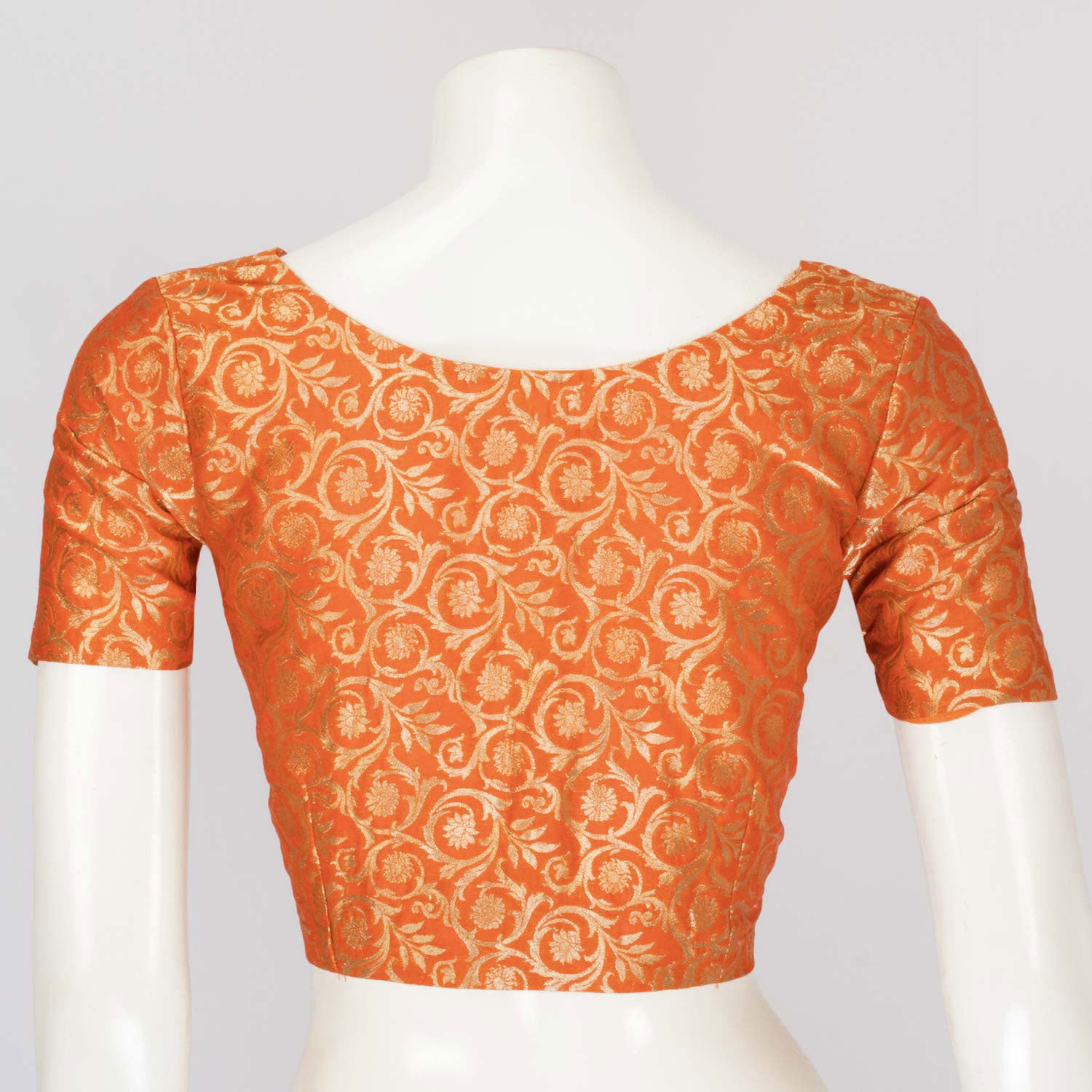 Orange Handcrafted Brocade Banarasi Silk Blouse with Short Sleeve. This blouse is designed with care and features exquisite embroidery for a statement-making look. It's sure to become a favorite in any wardrobe.