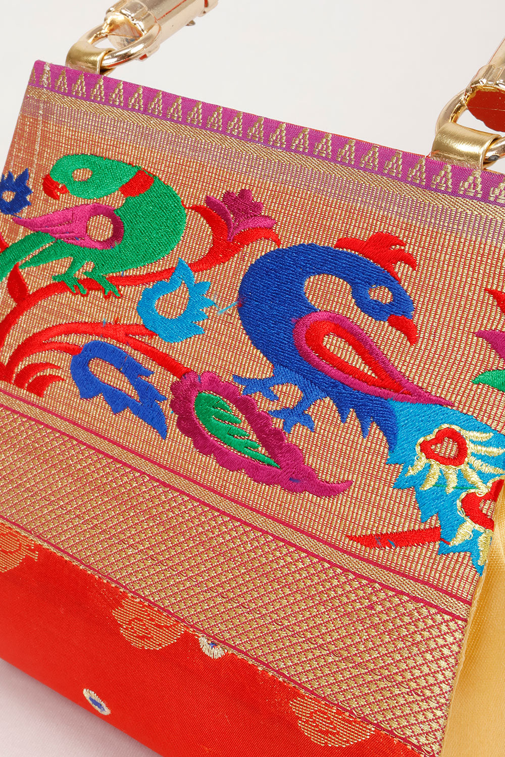 This bright orange Handcrafted Paithani Potli Bag is a perfect way to add a pop of color to your wardrobe. Perfect for all levels of sophistication, this bag is sure to be a go-to in your collection.
