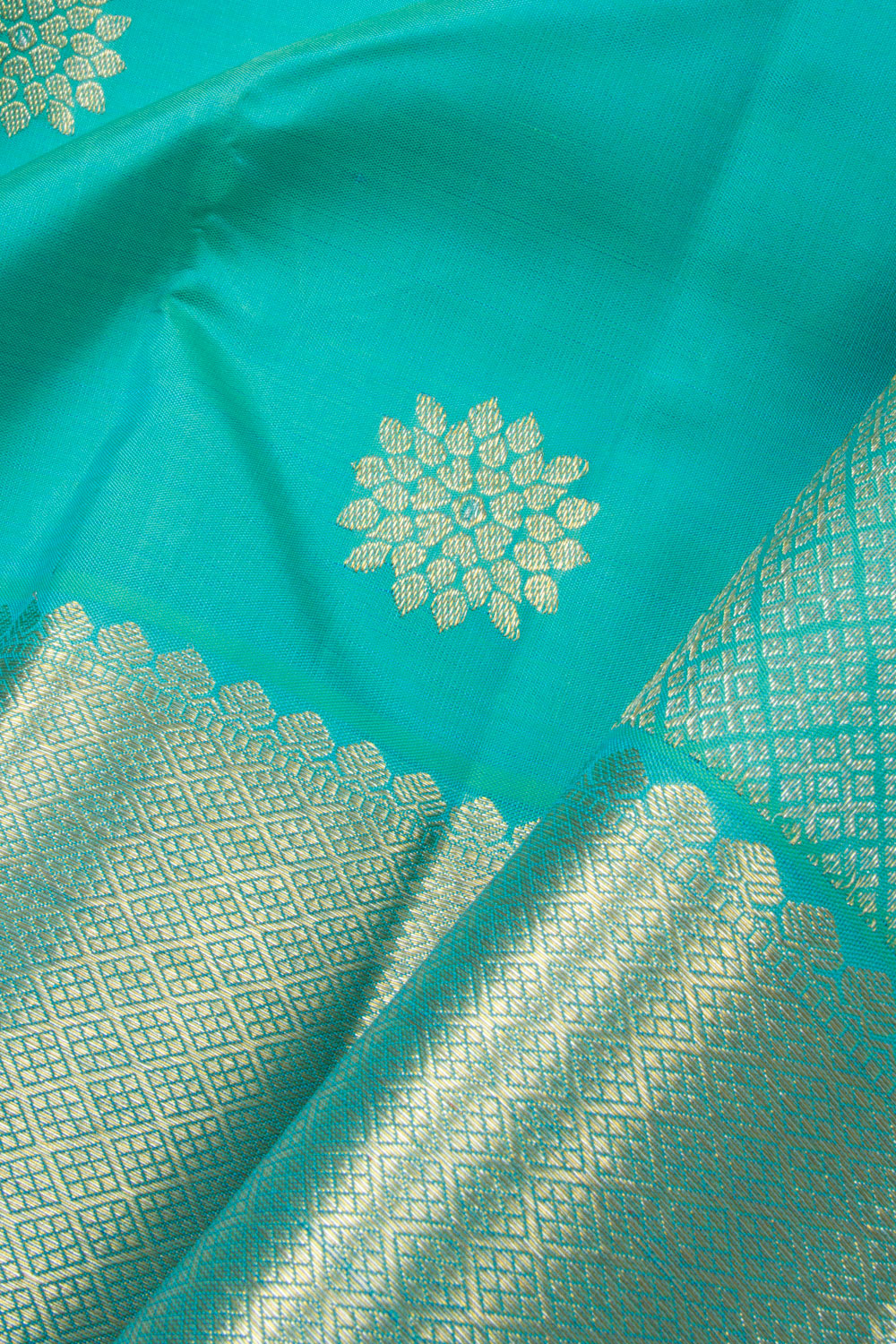 Pacific Blue Pure Zari Kanjivaram Silk Saree features floral motifs across the body and a zari border with floral motifs and diamond patterns. The saree is completed with a matching blouse and is ideal for weddings, parties, and other special occasions due to its stylish contemporary tone and muted zari weave.