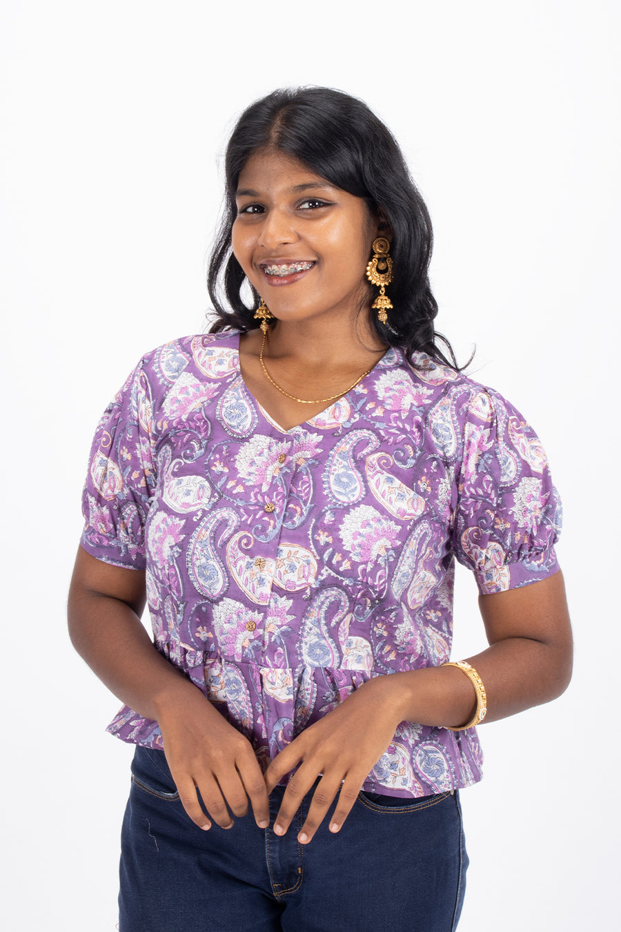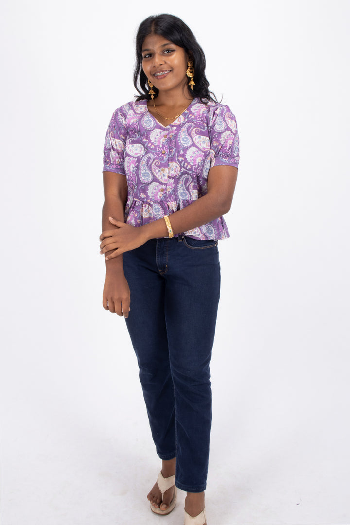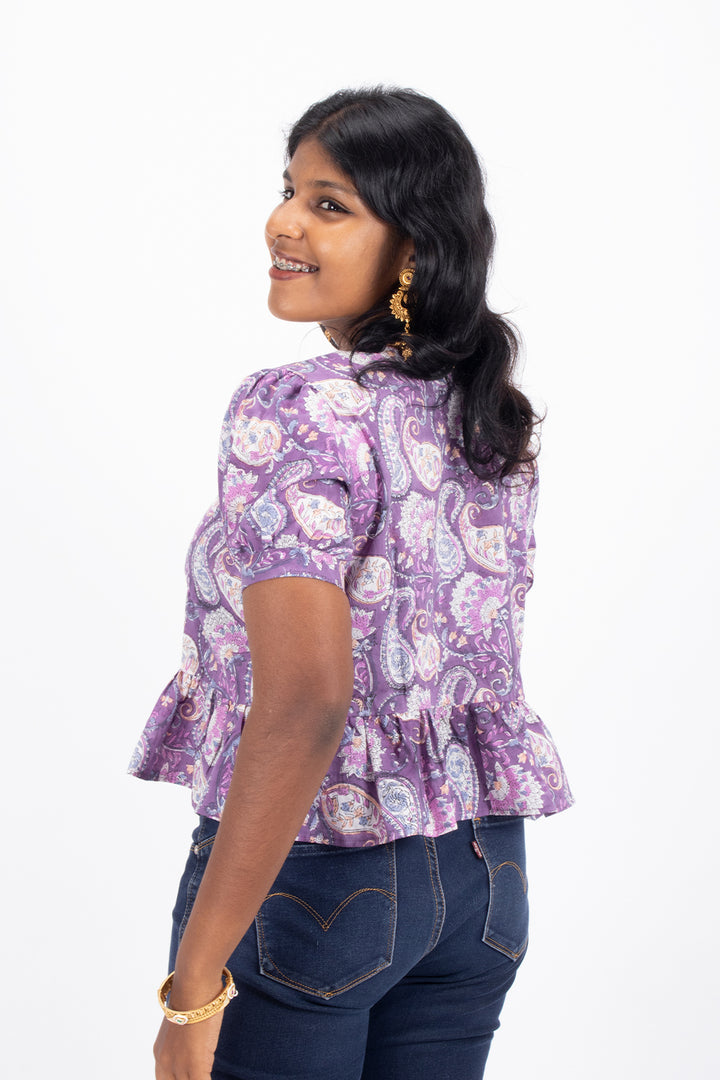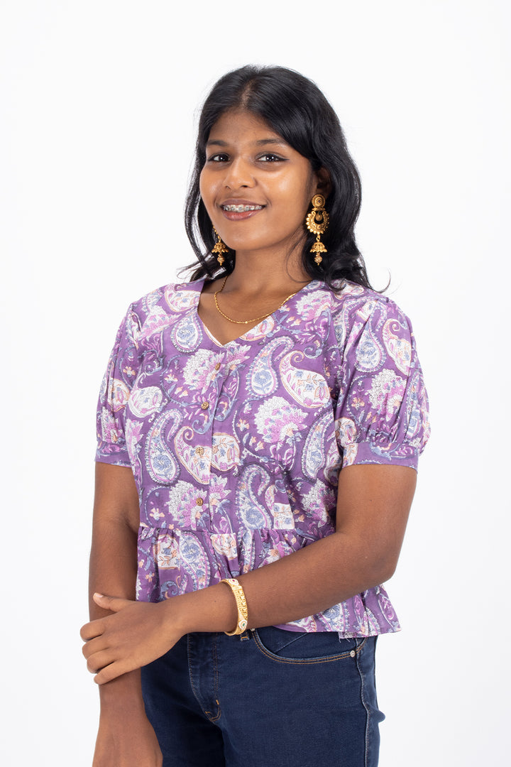 Elevate your casual wardrobe with this Purple Hand Block Printed Cotton Crop Top. Crafted from breathable cotton, it offers comfort and style for warm days. The intricate hand block print adds a unique, artisanal touch, making it perfect to pair with jeans or skirts for a chic, effortless look. Embrace a blend of tradition and modern fashion with this versatile crop top.