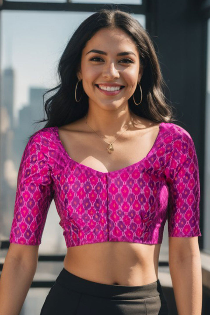 Pochampally Ikat is known for its precise, resist-dyed patterns created even before weaving begins. Artisans calculate and dye each thread so that when woven, intricate geometric or abstract motifs come alive on the loom. In this blouse, the technique meets a silk-cotton fabric to deliver both texture and tradition.