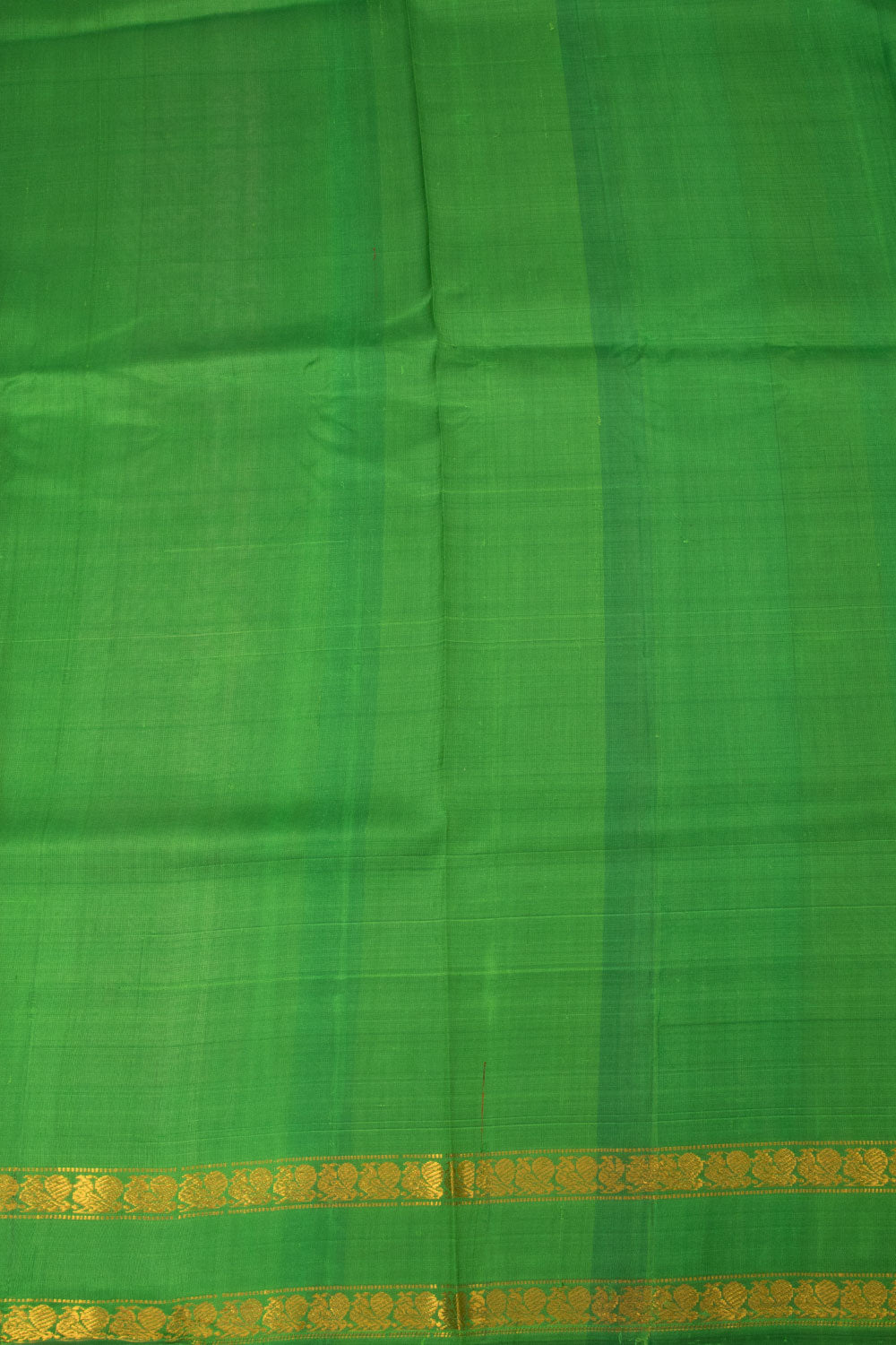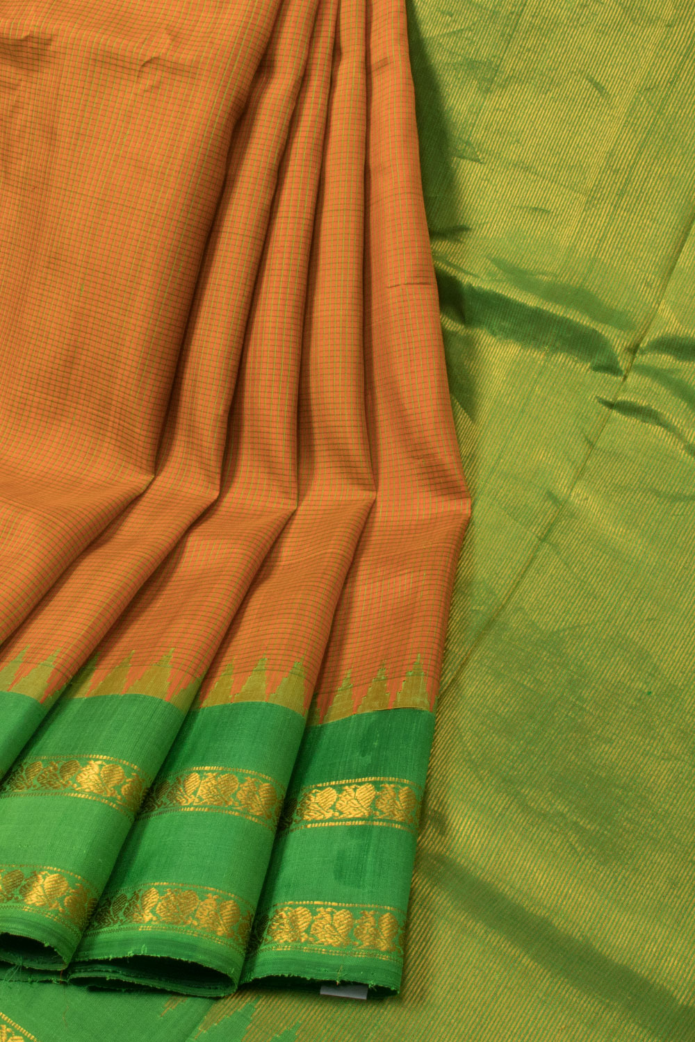 Rust Orange Handloom Gadwal Kuttu Silk Saree with temple border design and Pallu in Green It's a lightweight pick that's perfect for warm weather and suits all occasions, from weddings to everyday errands.
