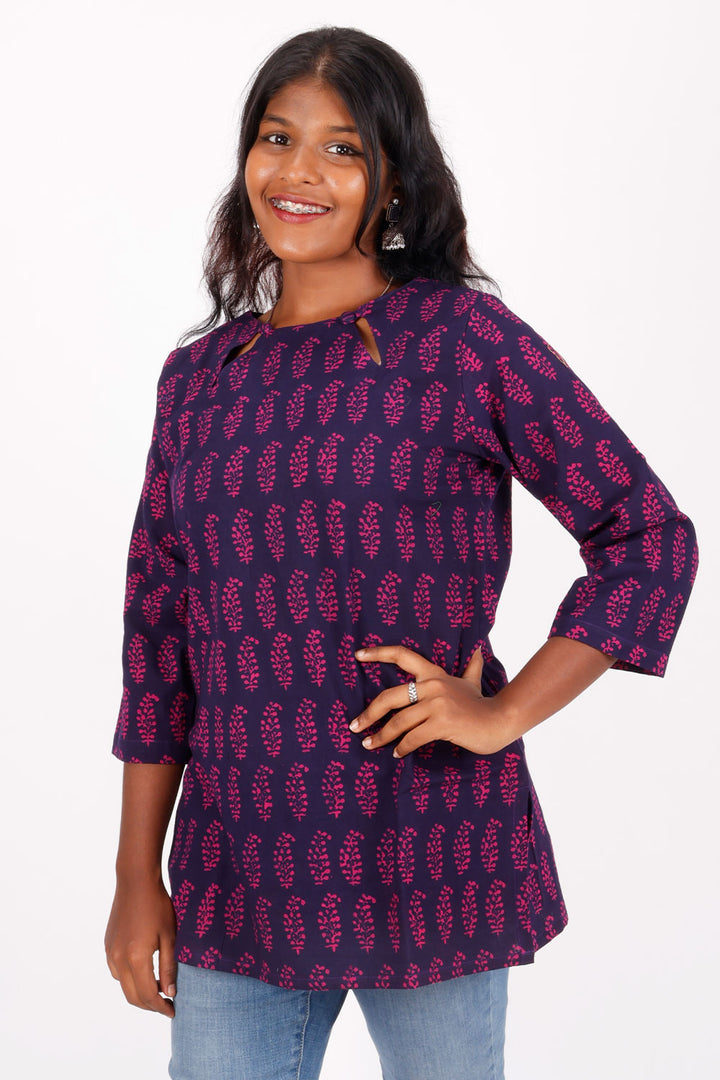 Space Cadet Blue Hand Block Printed Cotton Kurti 10071542