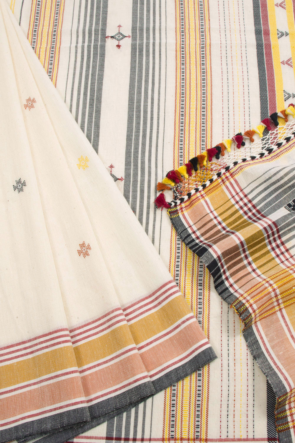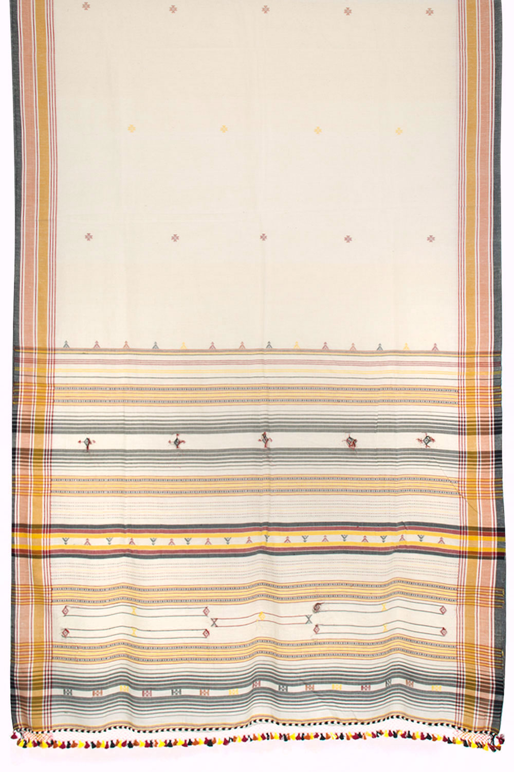 Handloom Bhujodi Kutch Cotton Saree with Floral Motifs and Fancy Tassels The saree is crafted with double yarn feature for extra durability and resilience. It is comfortable enough to wear all day for any occasion, perfect for making a statement.