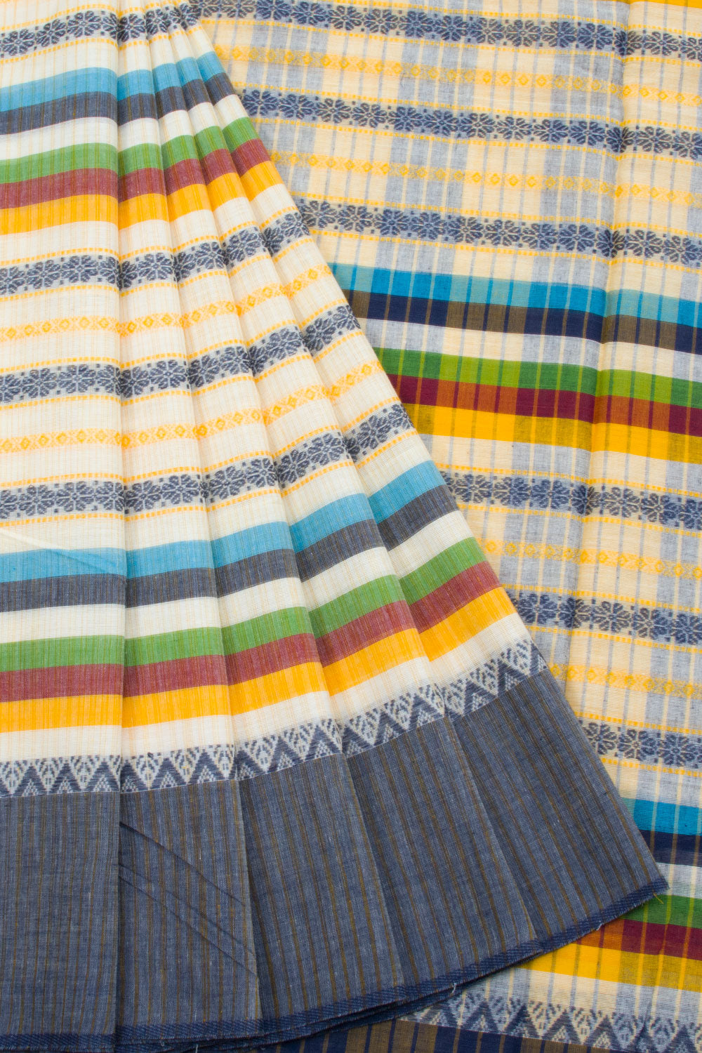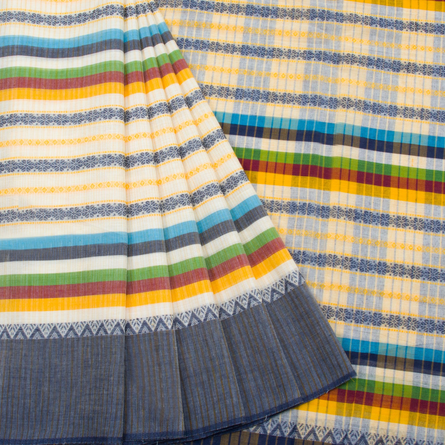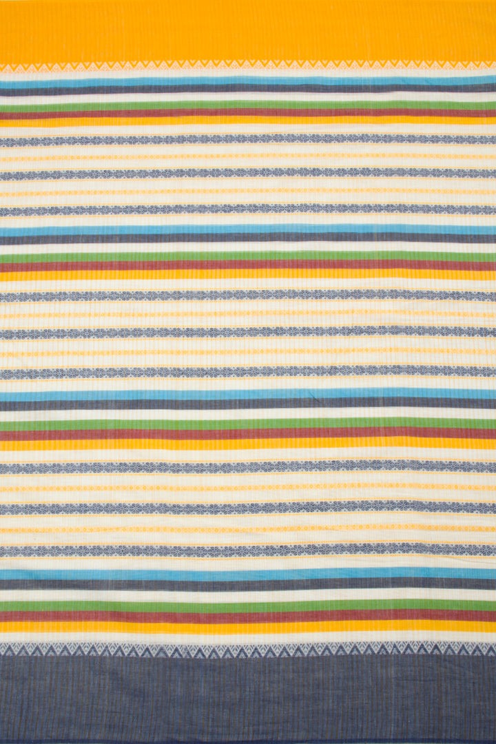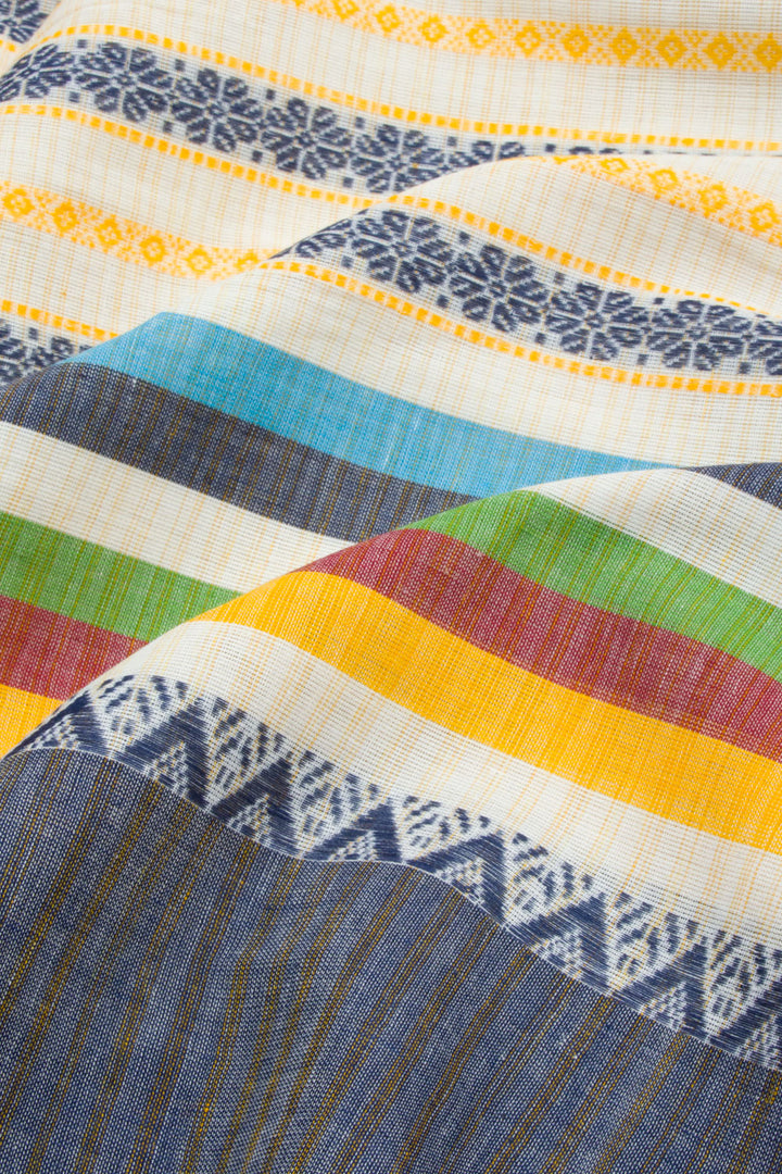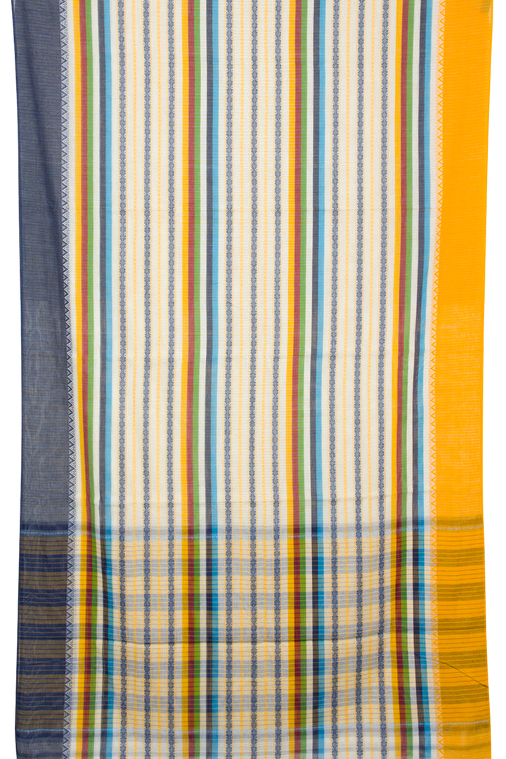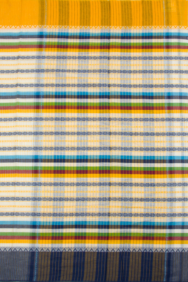 This White Handloom Dhaniakali Cotton Saree has a classic, timeless style and is crafted with high-quality materials. The saree features a beautiful Blue, Green, Yellow, Maroon stripes all over the border, and a striped design pallu. The lightweight fabric makes it perfect for all-day wear, and its soft texture is ideal for those seeking ultimate comfort.