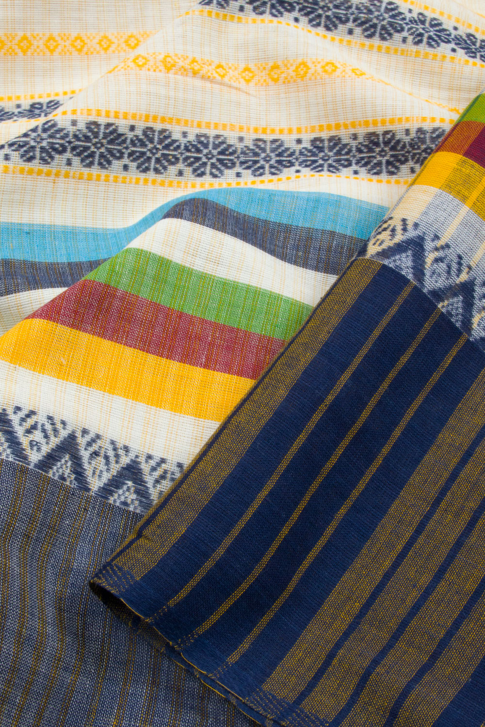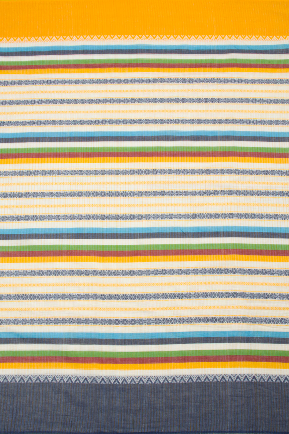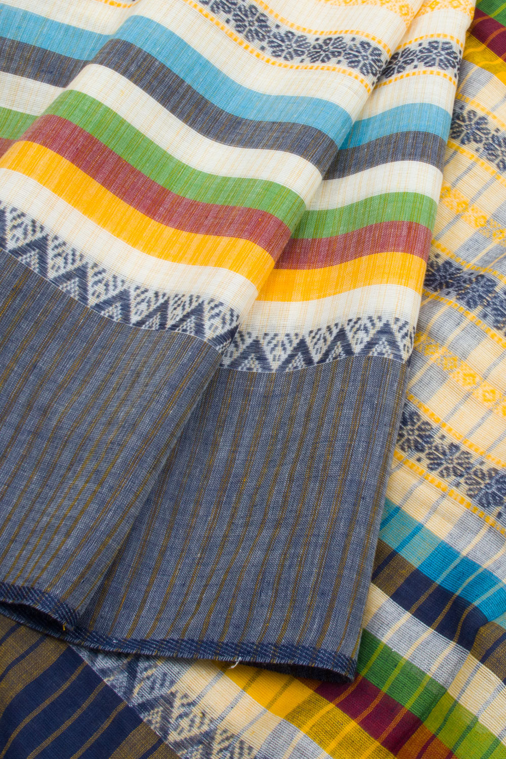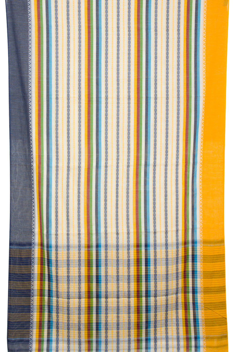 This White Handloom Dhaniakali Cotton Saree has a classic, timeless style and is crafted with high-quality materials. The saree features a beautiful Blue, Green, Yellow, Maroon stripes all over the border, and a striped design pallu. The lightweight fabric makes it perfect for all-day wear, and its soft texture is ideal for those seeking ultimate comfort.