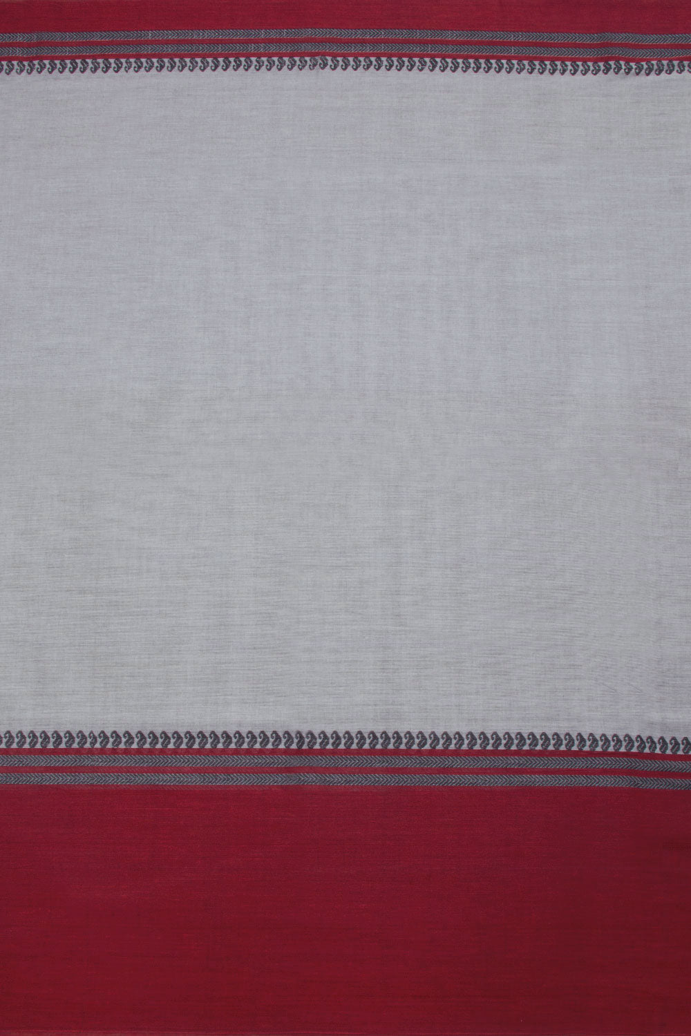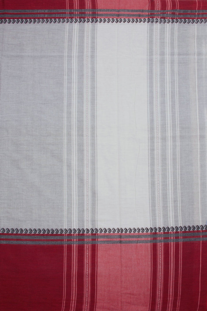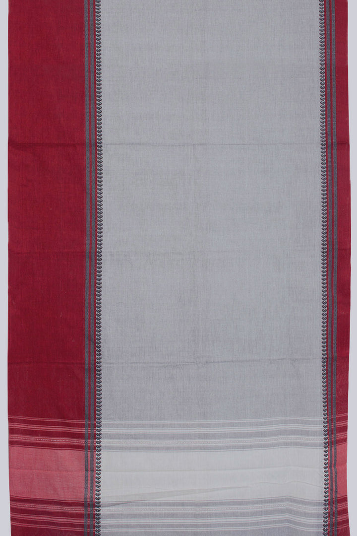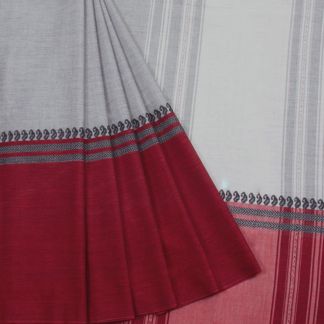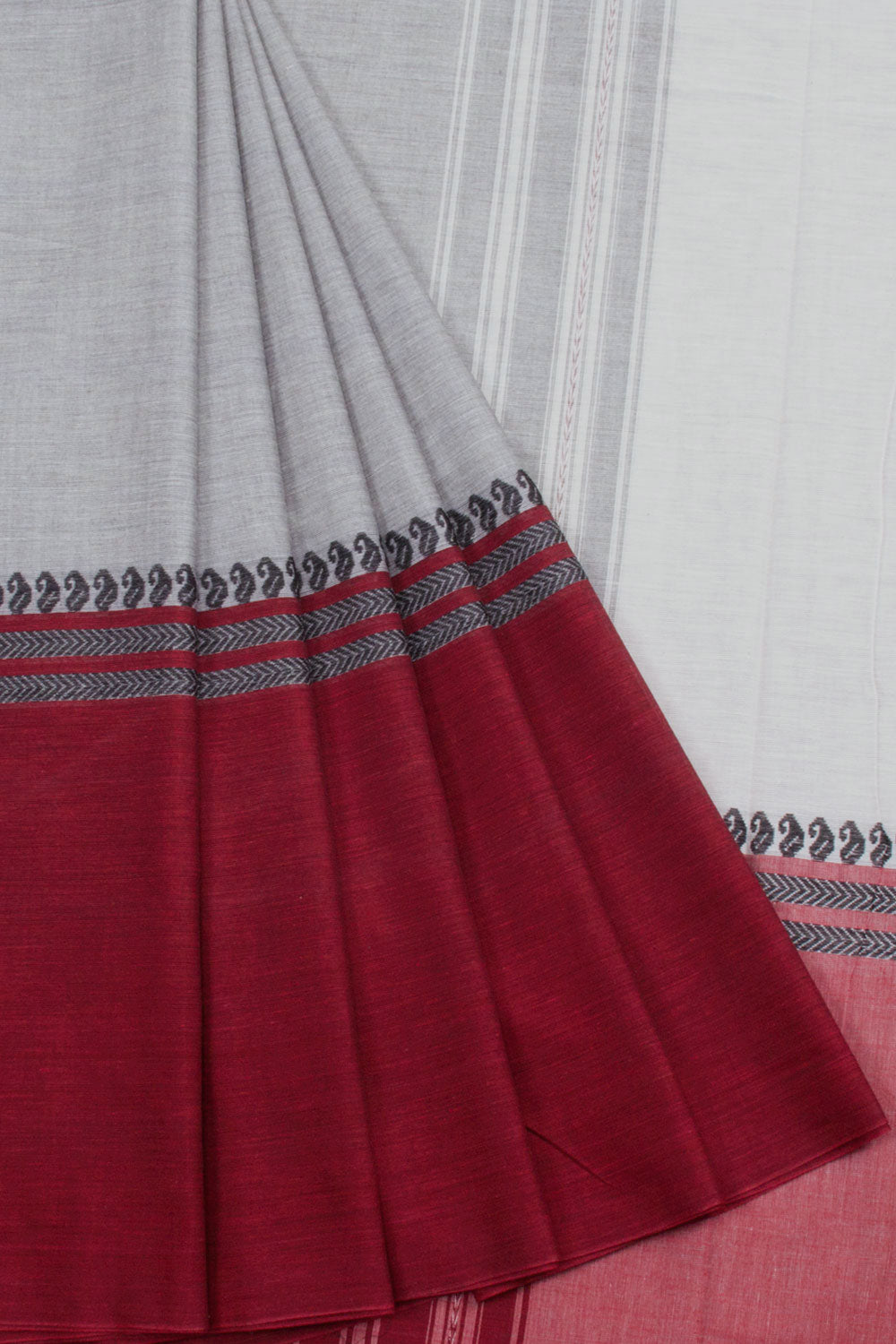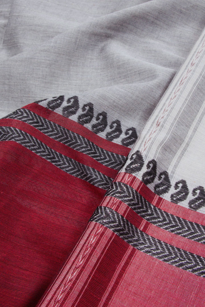 Grey Handloom Dhaniakhali Cotton Saree With Contrast Red Border. Border has Chevron Design and Paisley Motifs. Striped Pallu Crafted to perfection with intricate details, this saree is made of the finest quality cotton, making it comfortable and lightweight to wear. Perfect for any special occasion, it's sure to make you stand out in style.