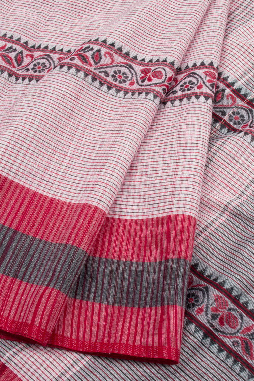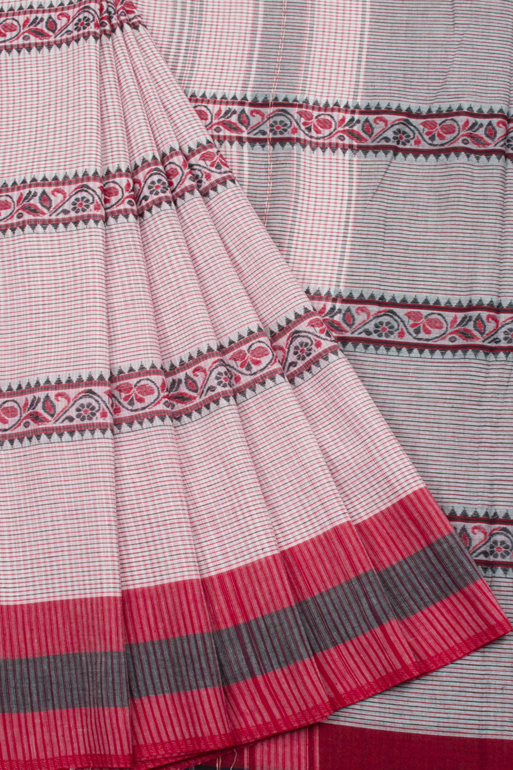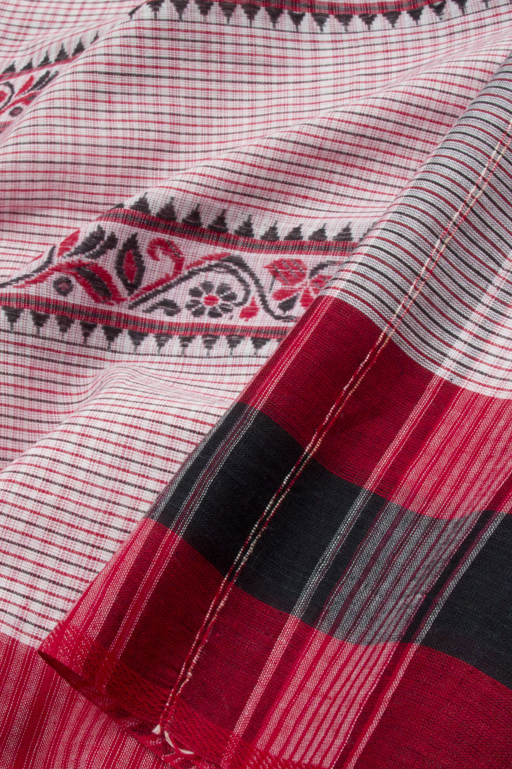 Pastel Pink Handloom Dhaniakhali Cotton Saree with Micro Checks Designs, Floral Bands, Red & Black Contrast Border and Striped Blouse This unique saree features a beautiful combination of thoughtfully woven micro checks, floral bands, and an eye-catching contrast border. The included striped blouse will ensure you look stunning at any occasion.