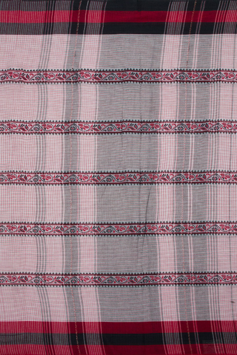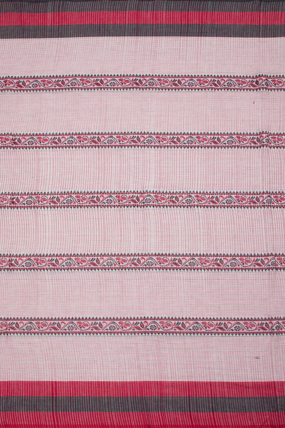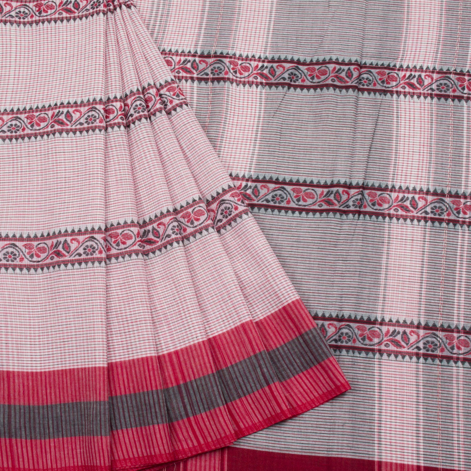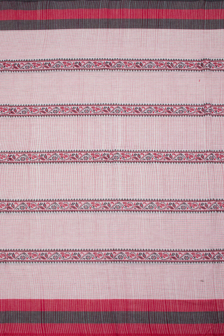 Pastel Pink Handloom Dhaniakhali Cotton Saree with Micro Checks Designs, Floral Bands, Red & Black Contrast Border and Striped Blouse This unique saree features a beautiful combination of thoughtfully woven micro checks, floral bands, and an eye-catching contrast border. The included striped blouse will ensure you look stunning at any occasion.