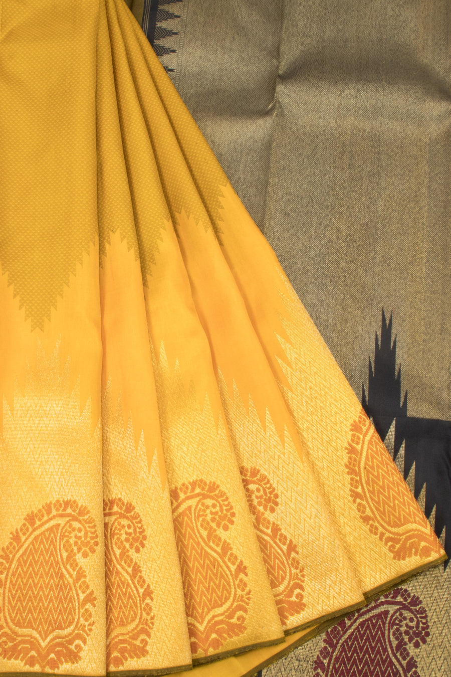 This sophisticated Yellow Pure Zari Jacquard Kanjivaram Silk Saree features Arai Maadam Designs across the body. The Temple Design Border is adorned with distinguished Paisley Buttas, and the Paisley Pattern is continued in the Black Tissue Pallu. To finish the look, a Contrast Black blouse with Zari stripes is included. The finely-crafted weave gives the saree a graceful drape and a flawless appearance.
